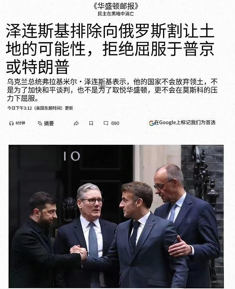 华盛顿邮报8日罕见的以“泽连斯基排除向俄罗斯割让土地的可能性,拒绝向普京或特朗普屈服”为标题点出俄乌和平进程中的核心矛盾。看到这些新闻第一感觉就是:欧盟领导人太忙了,欧洲领导人好忙啊,忙着开会、忙着拍照、忙着开新闻发布会。按照他们这效率,乌克兰征兵搞不好要放宽到55岁了。不知道乌克兰人打了将近四年,大家心里怎么想的?