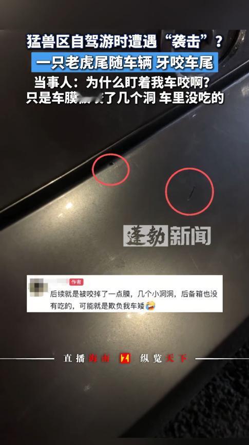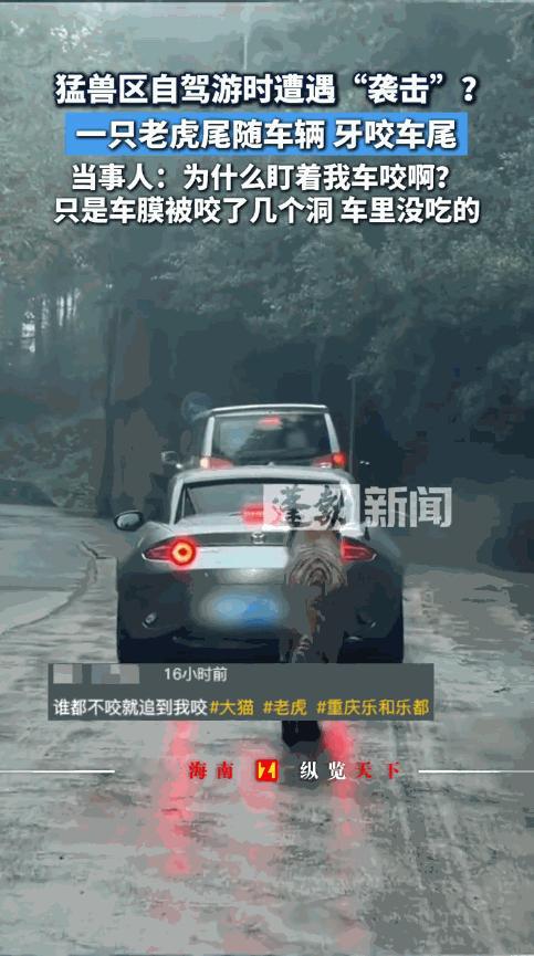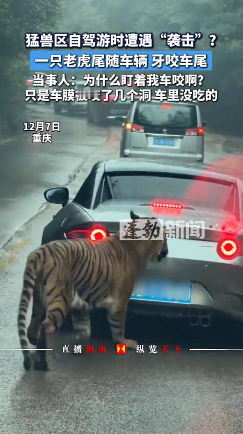 “离了个大谱!”12月7日,重庆,一女子开车逛动物园,行驶在猛兽区时,被一只老虎“尾随”,明明周围都是车,却只跟在她车后追着咬,虽然车子没被咬坏,但是车膜漏了好几个洞!女子:后备箱没吃的,可能是因为自己的车矮。 现在很多动物园,为了增加游客的体验度,会将猛兽区开放出来,允许自驾游,在此过程中,游客们能够近距离的接触到猛兽,但也要注意安全,不能私自下车、打开车窗,不然很容易发生意外。 事发当天,涂女士和几个朋友一起去动物园玩,他们开车经过猛兽区时,几只老虎很配合的走了过来,对着车子一阵打量。 可是令涂女士没想到的是,一只老虎却紧紧跟在自己的车后,甚至还不断地咬后备箱,涂女士非常纳闷,怎么周围那么多车,就盯着自己的车咬啊,自己也没准备食物。 这一过程被后面的朋友记录下来,最终发到了网上。视频很快就吸引了不少网友,大家对此议论纷纷,有人猜测是女子的车最小,所以被老虎当成最适合捕捉的“猎物”,所以才一直紧跟不放的。 当然,也有人觉得就是后备箱里有什么东西,散发出来的独特气味,吸引了老虎的注意力,这才跟着女子的车跑的。 信息来源:《女子猛兽区自驾被老虎盯上追着咬》向阳视频