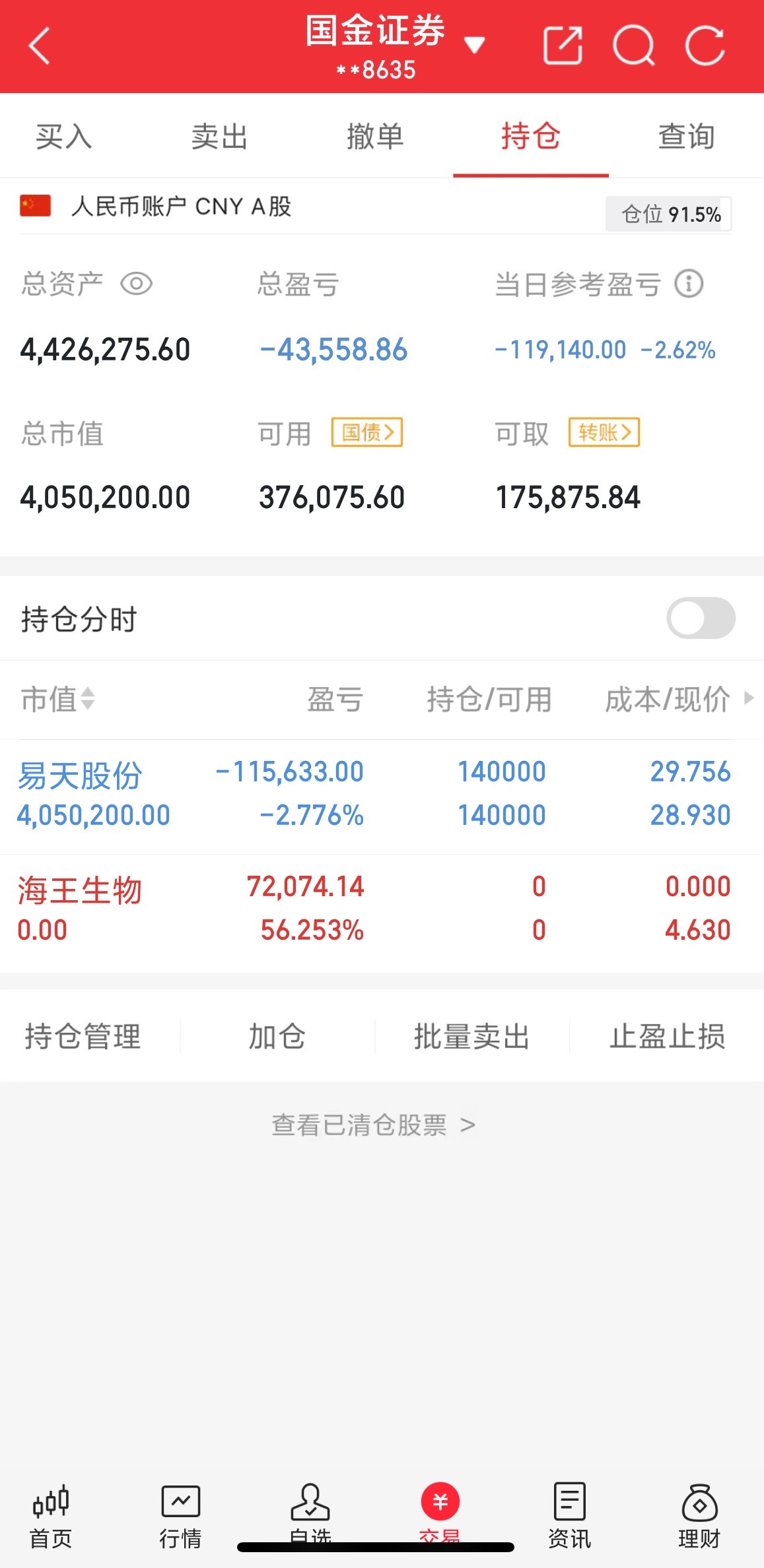 200w本金,目标1年做到1000w,1年翻五倍,欢迎各位关注验证!(第106天)今天买入:今天卖出:海王生物继续持有:易天股份盘面出现了1个重要信号:隔夜外围三大股出现了小幅下跌行情,今天A股回踩探底,金属和证券板块跌幅居前,昨天大盘冲到3936点的时候柒柒强调冲高做减法,周二准备回踩蓄力的行情,今天如期回调了,别慌!回调就是倒车接人,明天周三有望探底回升的行情。感谢大家的支持与互动,点赞富一生,评论666股市一路长虹特别声明:这只是我个人的操作记录,不作为任何投资建议,更不是劝你们跟买! 股市有风险,投资需谨慎!股票投资今日股市