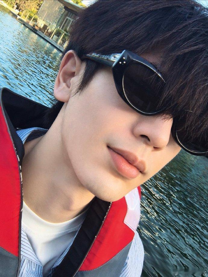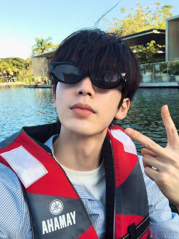 张凌赫墨镜比耶照休假张凌赫传来明信片休假去划船啦