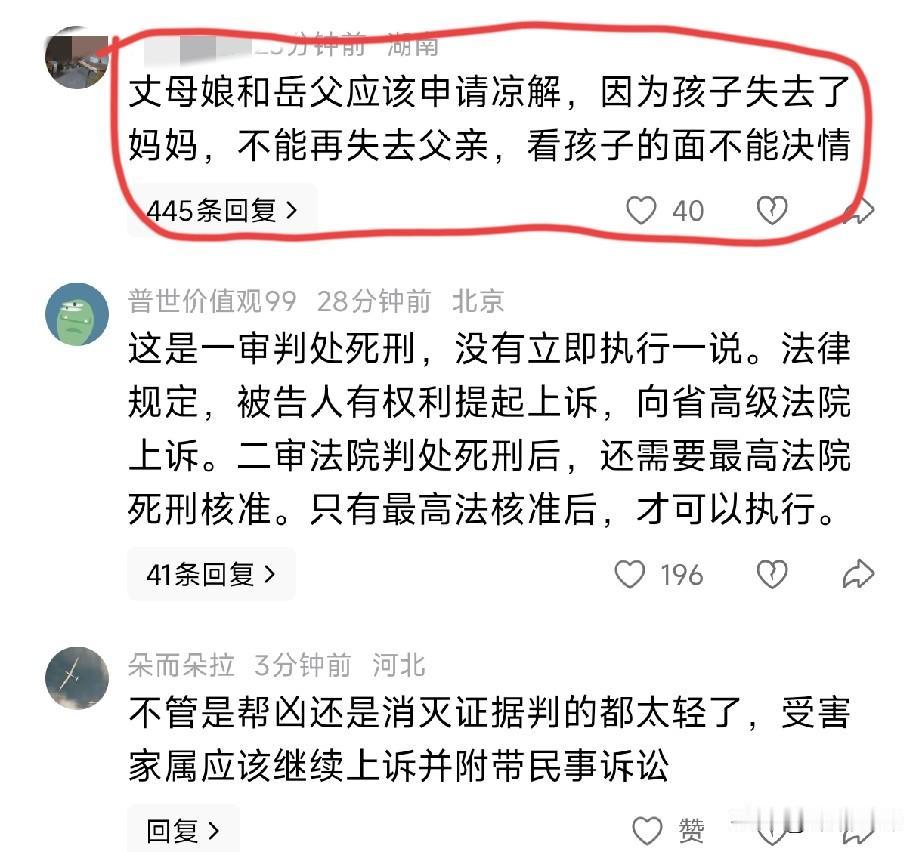 河北沧州杀妻案:丈母娘和岳父应该申请谅解,因为孩子失去了妈妈,不能再失去父亲,看孩子的面不能绝情。 被上面这条评论惊呆了!这是一个正常人说出的话吗? 央视新闻最新消息:河北沧州杀妻案一审公开宣判,被告人金昊被判处死刑,剥夺政治权利终身。被告人金昊的母亲张杰,因帮助儿子毁灭犯罪证据,被判有期徒刑两年两个月。 丈夫杀妻,性质恶劣,情节严重,后果悲惨。丈夫被判处死刑是法律庄严、人心所向,是对坏人的最有力的惩处,更是对死者父母的心灵慰藉。 被害人刘某某,本来是一个美丽善良的姑娘,她从小是在家人的呵护下长大的,是爸爸妈妈的掌上明珠。在披上婚纱的那一刻,她也曾憧憬着幸福的未来生活,刘某某的父母为了女儿的幸福,结婚时陪嫁了几十万。 刘某某婚后下决心做一个好妻子,她洗尽铅华,为老公洗手作羹汤,任劳任怨的包了所有家务。有了孩子后,她事事亲力亲为,事无巨细的照顾孩子,她是一位好母亲,她爱她的儿子胜于一切。 就是这样一个好女人,婚后不久就遭遇了丈夫的背叛,丈夫为了怀孕的第三者逼刘某某离婚,刘某某为了孩子不同意离婚,就多次遭到丈夫的暴力殴打。 刘某某为了孩子委曲求全,换来的是金某的变本加厉。最终在2025年8月22日被金某杀害。刘某某的父亲到医院后,看到自己的宝贝女儿脸部呈青紫色,有伤,腿部也是紫色。CT检测脑部有血块儿,肿块儿,肺部受伤,腰部骨折,已没有任何生命迹象。 为了给自己开脱,金某企图瞒天过海,弄了一张医院的死亡证明,证明显示:刘某某是因为心梗死亡。但刘某某的父母不接受这个死亡证明。 刘某某身上鼻青脸肿,眼圈乌黑,身上有明显的新伤和旧伤。这与心梗而死的特征差着十万八千里,是根本不可能的事。 最后,法医的鉴定白纸黑子写的清清楚楚,帽子叔叔明察秋毫,认定刘某某的死就是金某所害。刘某某的父母不要任何赔偿,只希望金某被判死。 2025年12月9日,沧州市中级人民法院判处被告人金某死刑。 金某的死是罪有应得,是他故意伤害一个无辜生命应该付出的沉重代价。 这时候,有个网友评论说:丈母娘和岳父应该申请谅解,因为孩子失去了妈妈,不能再失去父亲,看孩子的面不能绝情。 刘某某和金某两人的孩子只有3岁,尚在懵懂无知的年纪。没有了妈妈温暖的怀抱,没有了爸爸宽阔的胸膛,孩子的确是可怜的。但这并不是岳父岳母出具谅解书的理由。 金某长期出轨另一个女人,多次逼迫刘某某离婚,如果他爱他的孩子,念及孩子年幼不能离开妈妈,就不会出轨,不会逼妻子离婚。从这一点看,金某根本不爱自己的儿子,最起码没有那么多的爱。 金某逼妻子离婚,却不把抚养权给刘某某。刘某某因为爱自己的儿子,担心儿子留在父亲身边儿子会受委屈,所以不同意离婚。金某家庭条件好,经济优越,如果金某非常爱孩子,刘某某怎么会不放心孩子留在金家呢?刘某某心知肚明,孩子留给金某,金某娶新妻后,孩子不会有好日子过。从一点来看,金某也不是一个值得托付的父亲。 当金某挥起拳头打妻子、拿起木椅砸妻子、抓起妻子的头发撞墙到时候,他没有因为她是自己孩子的妈妈而有半点怜悯之心,没有因为孩子而有半点犹豫。这样的父亲,还指望他有多爱自己的孩子吗? 即使金某不被判死刑,他又能为孩子带来什么呢?他能为孩子的成长洗心革面吗?他能培养出有正确三观的孩子吗?他能为孩子的身心健康让孩子的母亲起死回生吗? 面对这种情况,说让岳父岳母为了孩子放过金某的人是有多无脑? 三岁的孩子没了母亲很悲哀,父亲罪不容诛。他还有爱他的姥姥姥爷舅舅陪伴,相信刘某某的父母弟弟能给孩子最好的生活,最安全的照顾。希望孩子健康成长,一生无忧!