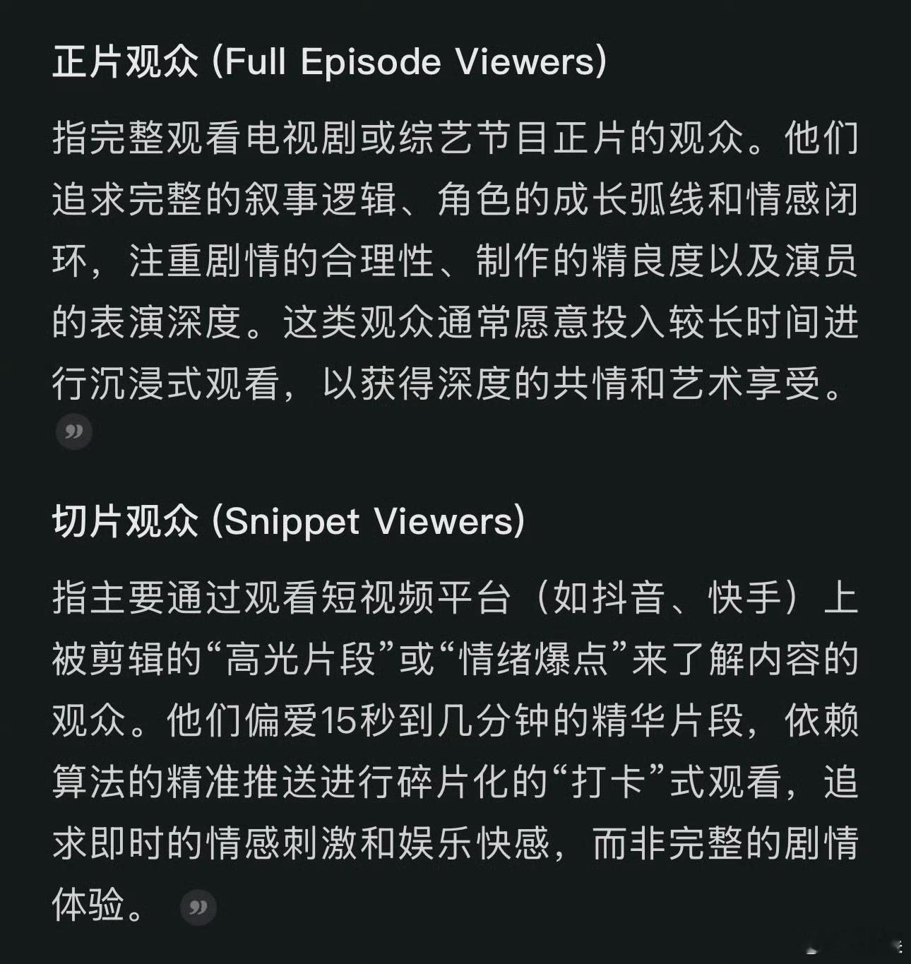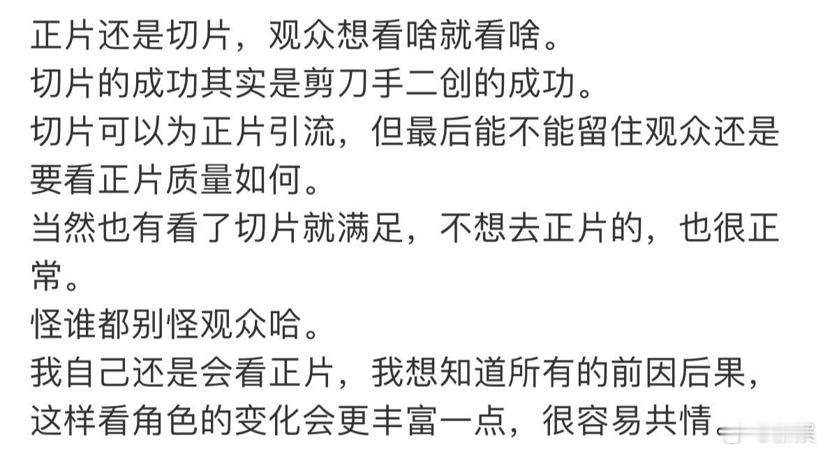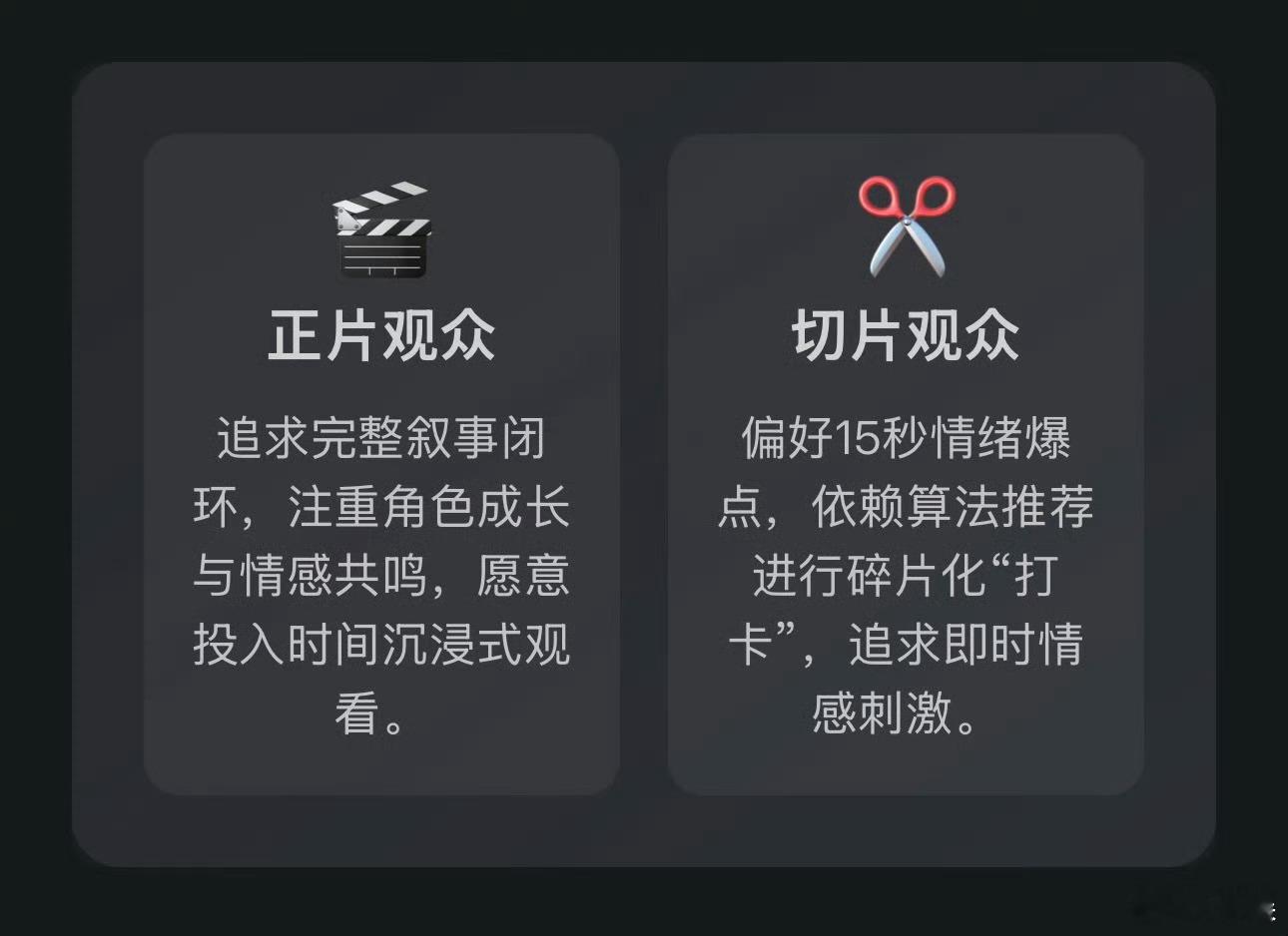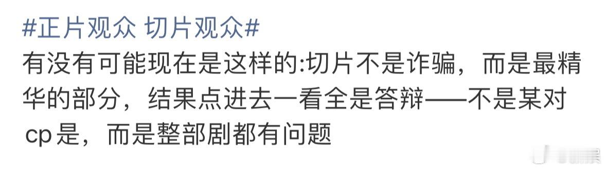 你被影视剧切片诈骗过吗谁没被几段“高能切片”勾着点开过一部剧?刷到某段眼神拉丝的对手戏,以为正片全是这种张力;看到某句戳心台词,脑补了一整部虐恋大戏,结果点开正片——要么前后剧情接不上,要么人设突然跑偏,那点期待感瞬间像被戳破的气球。其实观众对切片的期待,说到底是想找一部能“看进去”的剧,这种时候切片更像个“引子”,引着人去发现藏在后面的宝藏。或许没必要急着否定切片本身?毕竟好内容也需要被看见。只是如果切片里的高光,在正片里找不到根;如果为了剪片段,硬把剧情拧成奇怪的样子,那再花哨的切片也留不住人。反过来想,要是剧本身立得住,哪怕只是一个配角的眼神、一句生活化的台词,都可能成为让人追下去的理由。所以,切片到底是“诱饵”还是“窗口”?或许关键不在切片怎么剪,而在镜头之外,有没有足够扎实的故事等着观众去挖。你最近被哪段切片“骗”过,又被哪部剧的细节留住过?