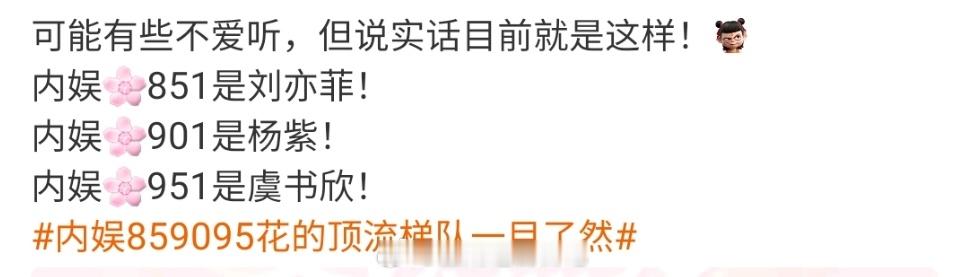 内娱859095花的顶流梯队一目了然 乐不乐又拉其他人悄悄抬咖咯~怎么说赵露思也是刚播完剧的,又踢出去了?虞书欣双轨都还没播