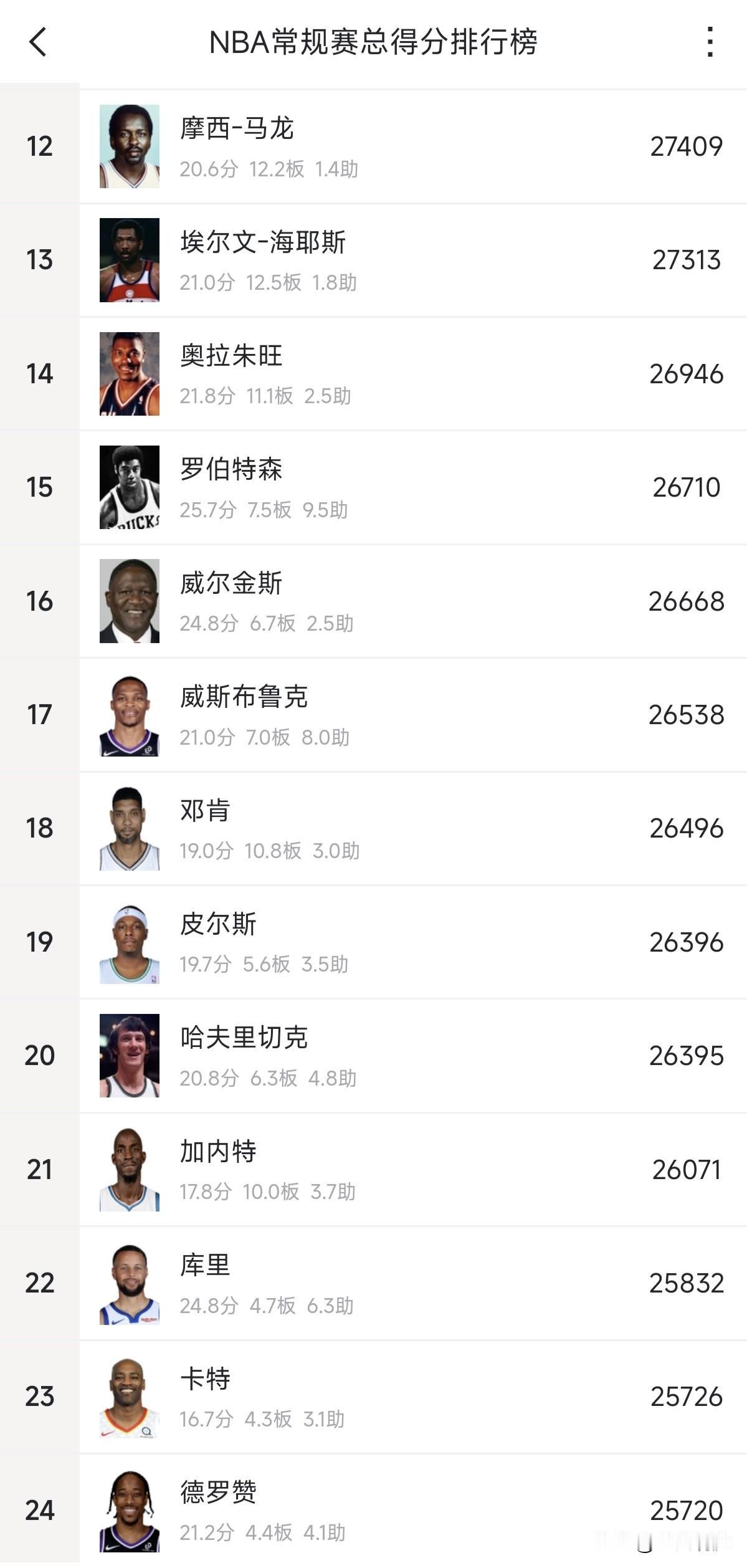 库里赶快复出吧,只差112分就要被德罗赞追上来了!如果不是最近伤停,也许库里总得分已经突破26000分大关。 下一场德罗赞超过卡特排名历史得分榜第23位没有问题了,毕竟只差六分了。本赛季库里和德罗赞超过27000分都有理论可能,前提是不要缺席太多比赛才可以。