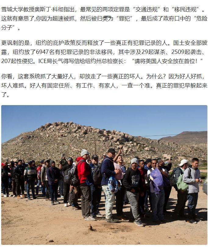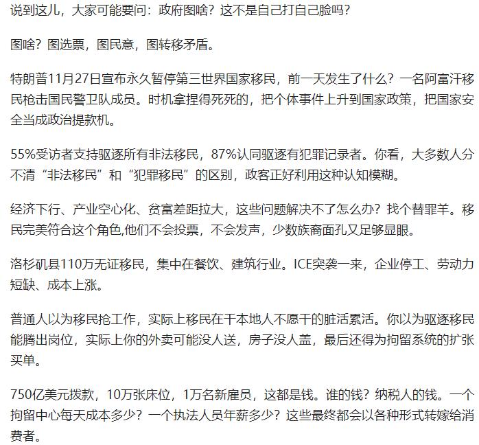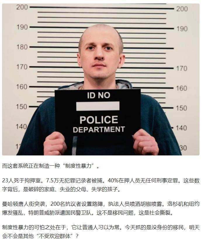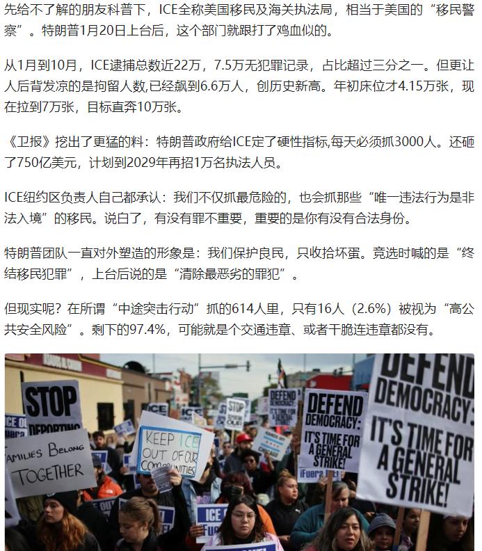 2025 年特朗普重返白宫后,美国移民及海关执法局(ICE)在 1-10 月间逮捕近 22 万移民,其中 7.5 万为无犯罪记录的普通人,占比超三分之一,而 “高公共安全风险” 者仅占极少数。 特朗普政府给 ICE 设定每日 3000 人的抓捕 KPI,砸 750 亿美元扩编拘留设施与执法人员,核心针对 “仅非法入境无其他罪行” 的移民,却放任纽约释放 6947 名涉谋杀、性侵等罪行的非法移民。 此举本质是政客的政治操弄:借阿富汗移民枪击事件等个体事件炒作移民安全问题,利用民众认知模糊转移经济下行、贫富差距等国内矛盾,将移民当作 “替罪羊” 争取选票。 政策已引发连锁反应,不仅导致餐饮、建筑等行业劳动力短缺,加重纳税人负担,还造成 23 人死于拘押、多地爆发抗议骚乱的社会撕裂,其 “制度性暴力” 隐患更值得警惕。 原文来自:IC实验室《特朗普ICE的“抓移民KPI”:22万逮捕,7.5万无罪》
