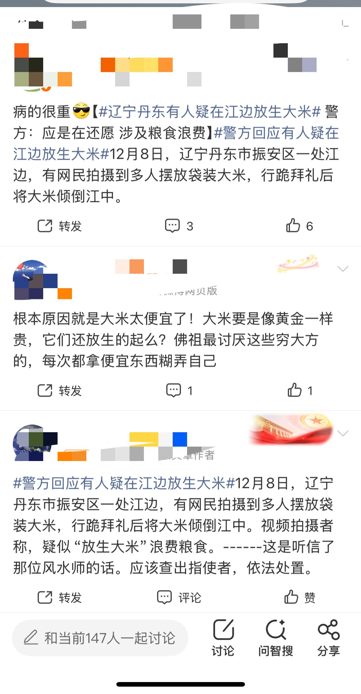 怪事年年有,今年还曾多?往江里倒大米算“放生”?别让盲目许愿,糟蹋了真正的福报 12月8日,一段视频让不少人看得直皱眉。在辽宁丹东的江边,一群人将一袋袋大米摆放整齐,跪拜后径直倾倒入江水之中。拍视频的人说,这疑似是“放生大米”。消息一出,争议四起。街道办回应活动未报备,警方已介入。而据派出所透露,这很可能是一种“还愿”性质的放生活动,虽不违法,但造成的粮食浪费,实在不该鼓励。 把粮食当作放生对象,听起来颇为新奇。传统的“放生”,本指救助动物,体现慈悲。但将大米倒入江河,美其名曰“放生”或“还愿”,这其实已偏离了本意,更像是一种对民俗的盲目模仿和资源的直接浪费。警方“不予鼓励”的表态,很能代表大众的观感,还有网友笑称,这怕不是放生,是“打窝” 为什么这种行为让人格外关注?因为它撞上了社会越来越强的“节约共识”。据统计,我国每年在收割、存储、运输、加工等环节损失的粮食高达数百亿斤,而餐桌上的浪费更是惊人。在许多人共同努力践行“光盘行动”的当下,这种成规模、仪式化地倾倒主粮的行为,无疑是一种刺眼的倒退。它浪费的不仅是粮食本身,更是背后的土地资源、水资源和农民心血。 在我看来,这种行为背后,折射出的是一种错位的“许愿心理”。祈求平安福报本无可厚非,但将愿望的实现机械地与某种形式挂钩,认为只要完成了“倒大米”这个动作,福气就会自动降临,这实则是一种懒惰的迷信。真正的“福报”和“还愿”,应当体现在向善的实际行动中,比如帮助真正需要的人,那或许比倾倒粮食更有功德。 传统文化中的良俗,值得我们尊重与传承,但前提是理解其内核,并与时俱进。任何形式的浪费都不可取。也希望更多人能理性看待传统习俗,别让美好的心愿,走了形,变了味,最终变成一种令人叹息的浪费。真正的虔诚与积累福德,永远在于一颗向善和珍惜的心,而非形式主义的糟蹋。海里倾倒大米 放生