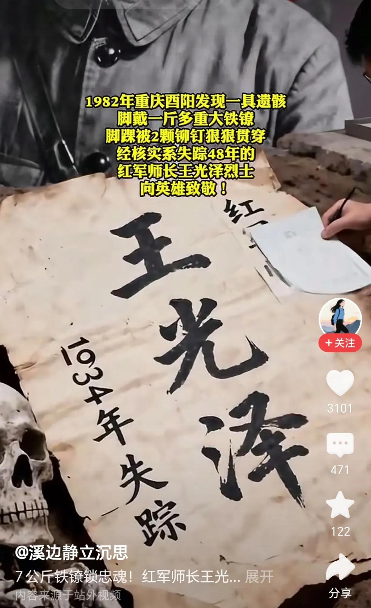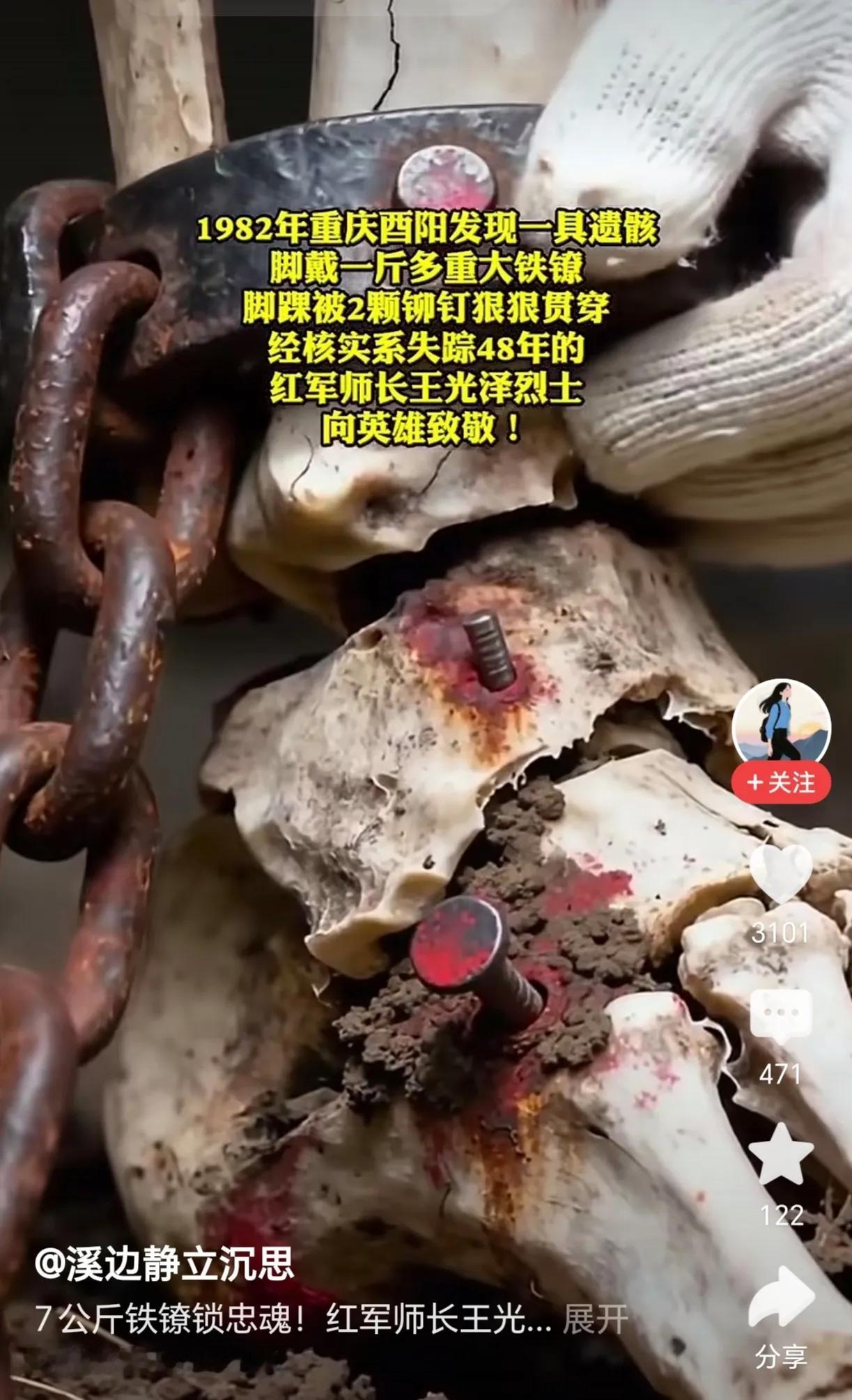 看着红军烈士的遗骸流泪流满面,蒋介石反动派太凶残了!硬生生的把铁钉打进红军师长的骨头里,可以想象当时红军王师长忍受了多么大的痛苦!王光泽(1903年-1934年),湖南衡东县城关镇鹤桥村人,红军黔东独立师师长,革命烈士。1934年11月29日,在长征途中分散突围时,王光泽在秀山不幸被俘,敌人对王光泽施以酷刑,在王光泽的脚上用烧红的粗铆钉将脚镣钉死。12月21日,蒋介石电令刘湘将王光泽就地处决,王师长年仅31岁。1982年4月,王光泽烈士的遗骸被找到。蒋介石反动派残害了无数的英勇烈士,犯下了滔天罪行,天地不容!太心疼了,在当时王师长不知道受到了多少委屈和折磨!忘记了过去,就意味着背叛。我们永远不要忘记那些为了人民的幸福英勇献身的先烈们,也不能忘记那些残暴无情、令人发指的恶魔们!致敬革命先烈!看的人好心疼啊,这就是一个军人忠于国家信仰的体现,我们今天的幸福生活来之不易,我们一定不忘历史,铭记先烈,王军长您安息吧!