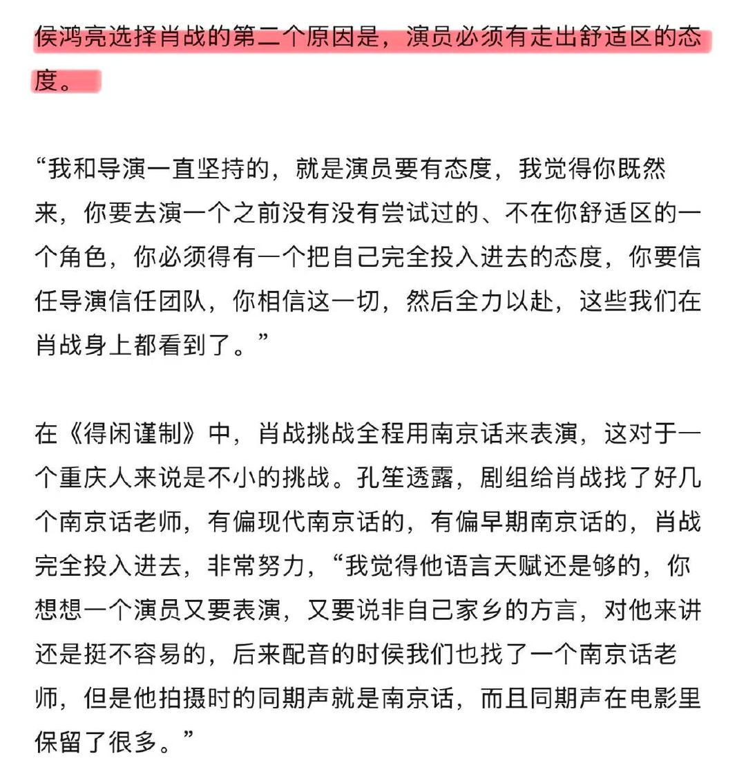 得闲谨制选择肖战的原因侯鸿亮对肖战的初印象是如梦之梦 《得闲谨制》导演、总制片人在采访中聊到《得闲谨制》选择的原因:眼神特别清澈、有走出舒适区的态度。采访中还提到,侯鸿亮对肖战的初印象是因为话剧《如梦之梦》。认识后双方一直在找寻合适的机会,莫得闲这个角色也考虑过很多演员,最终选定肖战。肖战辟谣为拍得闲谨制去工厂实习2个月