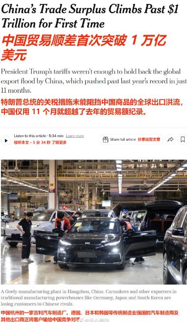 据《纽约时报》报道,特朗普的关税措施未能阻挡中国商品在全球攻城掠地,仅用11个月就实现贸易顺差首次突破1万亿美元,再次超越去年的贸易额纪录。 特朗普对关税这事执念挺深,今年4月就宣布要搞“对等关税”,还把实施日期一推再推,最后敲定8月1日正式落地,甚至放话对进口铜加征50%关税,给14国领导人写信威胁加税25%到40%。 他满以为这招能让制造业回流美国,还能靠关税填财政窟窿,毕竟他总说关税是“最美好的词汇”。 可现实跟他想的完全两码事,海关总署刚发的前11个月数据显示,中国贸易顺差直接冲到1.076万亿美元,比去年全年的9920亿美元还多,创下同期纪录。 美元计的出口额都到3.41万亿了,11月单月出口增速还回升到5.9%,CNN和华尔街日报都盯着这组数据说意外。 这么说吧,关税壁垒根本没挡住中国商品。韩国那边最明显,进口的1176种重点产品里,一半都来自中国,半导体需要的稀土金属79.4%靠中国供应,新能源车的核心材料几乎全是从中国进的。 摩根士丹利都预测,到2030年中国在全球出口的份额还得从15%涨到16.5%,毕竟电池、机器人这些领域的产能摆在那。 特朗普的算盘其实早漏了,美国彼得森研究所算过,新关税能让美国平均关税涨10到15个百分点,企业得多花4330亿美元成本,消费者买东西更贵了。 更关键的是,美国贸易逆差没减反增,2024年都到1.21万亿美元了,耶鲁大学的研究员早说过,这根源是美国储蓄率太低,跟关税没关系。 中国这边也不是刻意追求顺差,海关总署都说了,这是市场竞争和产业分工的结果。 说白了,全球供应链早离不开中国了,就算有些国家想diversify,可中国能提前布局产能、抓住需求趋势,这优势短期难替代。 美国自己的零售商都抱怨,关税把供应链搅得一团糟,最后还是老百姓买单。 现在看,特朗普的关税战更像“打地鼠”,摁下这边冒起那边,反而让美国成了“可怕的投资之地”。 中国外贸连续10个月增长的韧性,其实是产业实力给的底气。 以上都是个人观点,对此您有什么不同的看法,可以在评论区留言讨论!!!