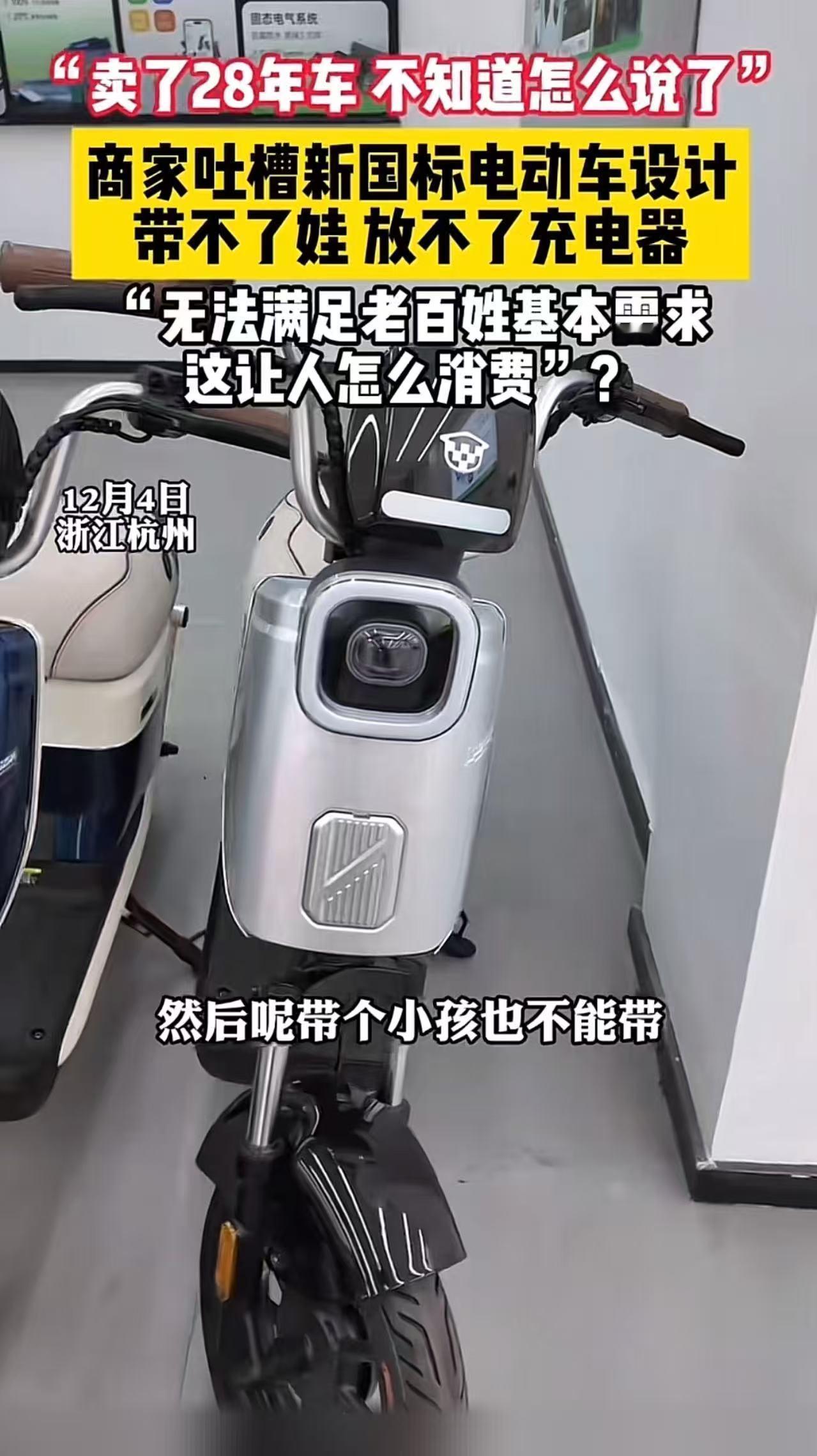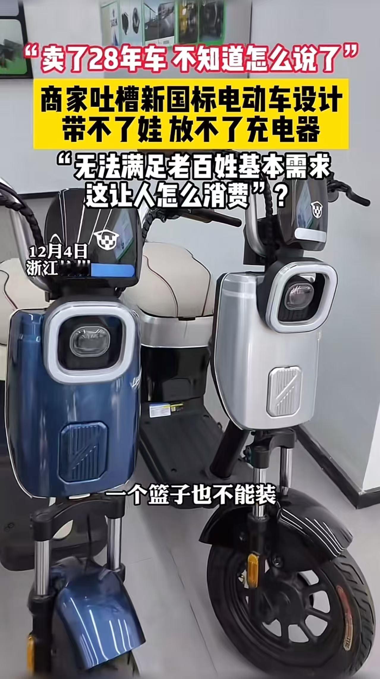 “我卖了 28 年的电动车了,不知道怎么说了……”商家吐槽新国标电动车设计,带不了娃,放不了充电器和雨衣,价格还更贵,无法满足老百姓基本需求!商户:“这叫老百姓怎么消费?狗看了都要摇头……”网友:看来以后经过电动车店不能摇头了…… (来源:小强热线) 新国标电动车开卖后,记者特意前往电动车店,打算了解一番商家的销售情况。刚走进店里,就听到商家唉声叹气,满脸愁容,直言生意惨淡得不行。 商家皱着眉头,无奈地说道:“我卖了28年电动车了,这会儿都不知道该怎么表达心里的想法了。这个新国标车子,我真不知道是哪个专家研究出来的,这设计也太让人摸不着头脑了。你说搞防阻燃,把速度适当降下来,这些为了安全考虑,咱老百姓都能理解,也支持。可你不能设计得这么不实用啊!一个车篮子都不能装东西,小孩也没地方坐。咱普通老百姓买不起小汽车,平时接送孩子上学放学,不就指望这电动车嘛。还有啊,没有座桶,也没有后备箱,充电器和雨披这些日常必备的东西往哪儿放?难道每天出门还得背个大包,把充电器、雨披都装在里面背着?这设计也太不合理了,要是我是来买车的,我肯定也不会买,我宁可买辆自行车呢,你说是不是这个理儿?现在顾客来了,我都不知道该怎么介绍这些车了,感觉说什么都没用。” 说实在的,我看了这新国标的电动车,也是一脸茫然。车价贵也就算了,可这设计简直让人哭笑不得。那坐垫儿,又薄又小,有些还是金属材质的。天气热的时候,坐上去烫得屁股生疼;天气冷的时候,又冰得人直打哆嗦;就算是不冷不热的时候,坐上去还硌得屁股难受。而且还要防着坐垫被偷走! 最奇葩的是,车座下面连个储物格都没有。充电器、头盔、雨衣这些常用的东西,根本没地方放。 以前骑着电动车,轻轻松松就能上坡,现在去地下室上个坡,都得推着走,累得气喘吁吁。 本来出台新国标的出发点是为了保障大家的安全,可现在车身变小了,为了让孩子坐上去,反而会冒险去挤,这样岂不是更不安全了吗? 就算不带孩子,平时去买菜,连个放菜的地方都没有,把菜挂在车把上,摇摇晃晃的,这不是更不安全吗? 我觉得那些研究新国标的人,首先得自己亲自开上一年半载的电瓶车,体验一下老百姓日常使用中的实际需求,而不是坐在汽车里,凭空想象地去研究。 专家可以把握大方向,给行业发展提供指导,但不能过度干预市场。这些电动车产品发展了这么多年,都是经过市场的考验和淘汰,自然选择留下来的,说明它们是符合市场需求的。厂家和老百姓比那些坐在办公室、出门开汽车的所谓专家,更清楚市场真正需要什么样的产品。 “以人民为中心”不能只是一句空洞的口号,得真正落实到老百姓的日常生活中。新国标出台前,有没有召开过让老百姓参与的听证会呢?毕竟电动车是老百姓骑的,任何设计都必须符合广大人民群众的合理需求和关切。现在设计人和使用人严重脱节,这就是目前最大的问题。 咱们作为工业大国,设计产品就得追求完美,注重方便实用,和生活紧密接轨。而不是设计出一堆让老百姓吐槽不断的槽点。现在卖电动车的商家骂,买电动车的消费者也骂,骂声一片,这真的该好好反思反思了。 如果不顾老百姓的实际需求,那么所谓的“新国标”只会让老百姓抵抗,无法真正服务于大众,更无法推动行业的健康发展。