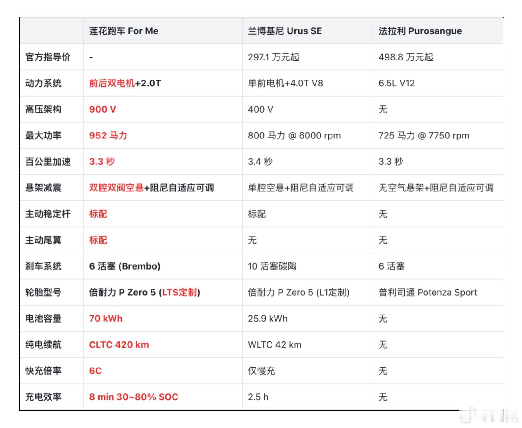 这是LOTUS莲花第一款量产的PHEV车型了。去了一趟FOR ME的私享品鉴会,先聊聊车:1、就叫FOR ME,对于国人来说名字起码比ELETRE好记;2、因为上了发动机的关系,占据了一些前舱的空间,所以之前ELETRE机盖上的风槽就没有了;3、主动进气格栅还是有,根据之前车主反馈难清洁的痛点,改成了条形状;4、插电混动车型也给你双出的排气;5、至于2.0T混动系统,70度大电池包,标配双腔双阀空悬和主动稳定杆这些相信各位都知道了。看图8、9,直接对标兰博基尼Urus和法拉利Purosangue,问大家,这类性能SUV你是要性能更强一点还是更悦耳的大排量轰鸣声?大v聊车性能车新能源大牛说