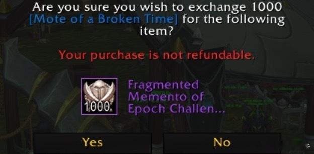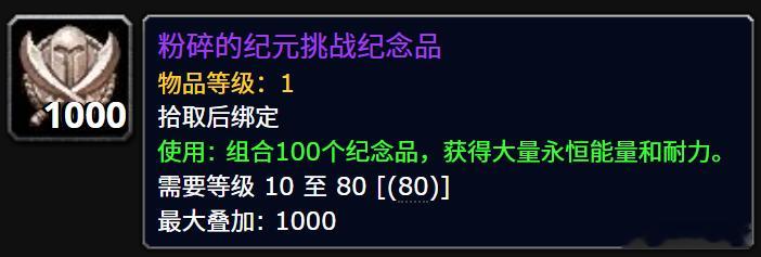 魔兽世界12月9日最新热修,现在允许玩家在军团再临remix中使用【破碎时间的微粒】兑换【粉碎的纪元挑战纪念品】。暴雪今天彻底放开了限制,而且兑换比例降低到了10个兑换10个。这意味着,现在玩家可以在永恒集市的艾鲁斯处进行无限制兑换。魔兽世界魔兽世界