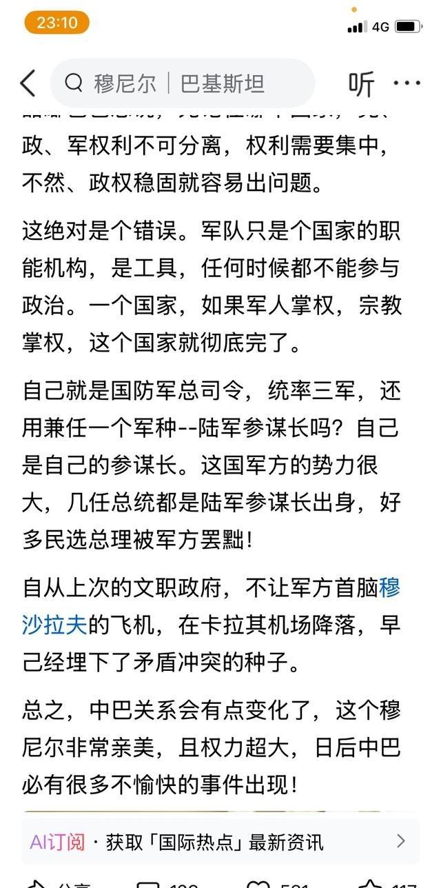 巴基斯坦陆军元帅穆尼尔现在手里握着大把实权,总统扎尔达里和总理谢里夫都得看他脸色行事。2025年12月4日,总统正式批准任命他为首任国防军总司令,任期五年,还继续兼着陆军参谋长。这事儿一出,国内有些人又开始嘀咕了,说穆尼尔太亲美,权力集中到这地步,还老插手政治,对盟友合作指指点点,怕以后中巴关系出岔子,闹出不少麻烦事。 这些人担心不是没道理。穆尼尔访美好几趟,跟特朗普吃过饭,美国那边把他当贵客,公开夸巴基斯坦反恐有功。他在白宫宴会上聊得热火朝天,美国中央司令部也给他好脸色。这让一些人觉得他偏向西方,权力这么大,万一在决策上偏心,容易生出摩擦。 不过话说回来,这种担心有点多余。中国在巴基斯坦的投资和项目那是实打实的,中巴经济走廊一直在推进,巴方高层反复强调这是铁杆兄弟关系,动不了根基。巴基斯坦宪法里没明文写中国地位,但双边协议和实际利益绑得死死的,穆尼尔再怎么调整,也得顾及现实。中国是巴最大债权国和投资者,军方也清楚这点,经常协调项目安全。 穆尼尔这人背景硬,2025年5月印巴冲突中指挥军队挡住印度进攻,击落几架印军战机,国内民意一下子就起来了,直接晋升元帅,这是独立后现役参谋长头一遭。冲突后他声望高,议会11月通过第27宪法修正案,新设国防军总司令职位,废掉旧的参联会主席,三军指挥权全归他,还给终身豁免。文官政府经济压力大,安全问题多,只能让步换稳定。 亲美是事实,美国拉拢巴基斯坦制衡地区局势,穆尼尔借此稳固位置。但他也没疏远中国,会见中方领导人,强调反恐合作,确保中国人员和项目安全。巴基斯坦夹在大国间,平衡是老把戏,穆尼尔玩得转。 要是真脑子犯浑想改大局,中国有的是办法让巴基斯坦清醒。边境上印度虎视眈眈,中国稍松口气,印度那边压力就上来了,巴方自己扛不住。历史教训多,巴基斯坦离不开中国支持,经济债务延期、投资续命,全靠中方帮忙。穆尼尔清楚这点,不会轻易冒险。 国内反对声还在,前总理伊姆兰·汗关在监狱,健康正常但隔离严,家属探视都难。他的党派被压着,反对穆尼尔的声音弱了。军方主导局面,短期稳定了边境,但民主空间小了,长期看隐患不小。 总之,穆尼尔权大,但巴基斯坦国情就这样,军方总在关键时上位。担心中巴出大事,纯属想多了,利益在那摆着,谁动谁吃亏。中国分分钟能让形势明朗化,放印度咬一口就够巴方喝一壶的。现实政治就这样,冷冰冰的算计多于情绪。