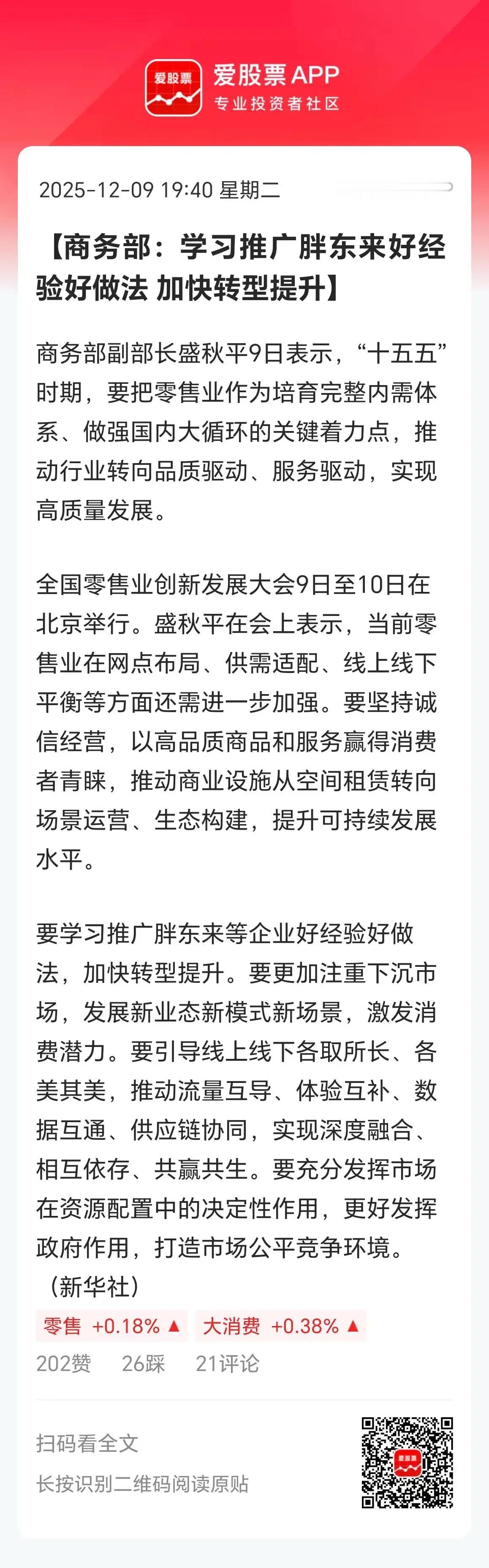 商务部说,“十五五”时期,要把零售业作为培育完整内需体系、做强国内大循环的关键着力点。要学习推广胖东来等企业好经验好做法,加快转型提升。难怪永辉超市2连板了,今天龙虎榜三大游资包场,陈小群大买3个亿。大游资的消息就是灵通啊!昨天政治局会议的通稿,分量最重的一句话:“坚持内需主导,建设强大国内市场”,说明扩消费是明年的头等大事!最近消费股太惨了,不管老消费的茅台,还是新消费的泡泡玛特,谁也别笑话谁。年底炒消费也是资金的选择之一,但涨的都是一些杂毛,正宗的不知道啥时候起来。