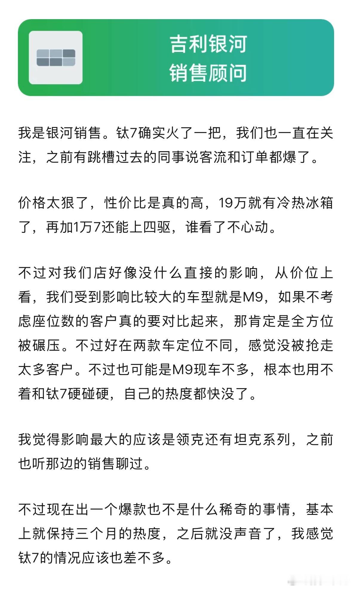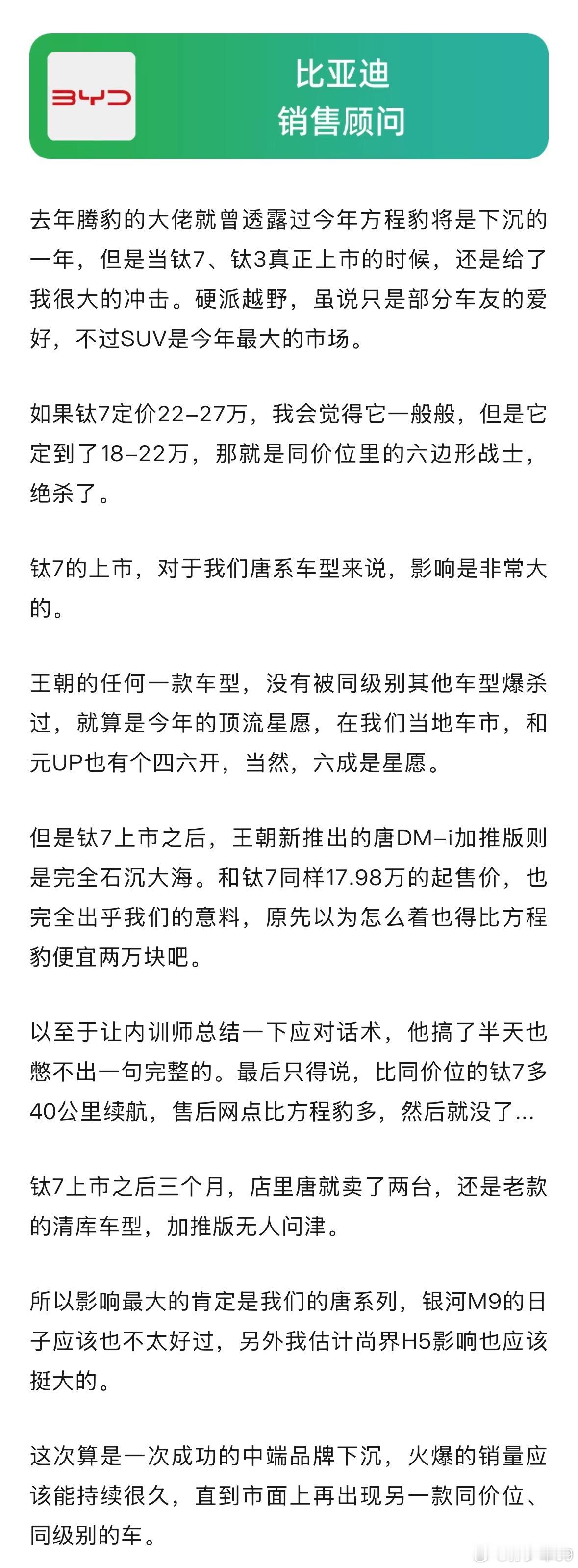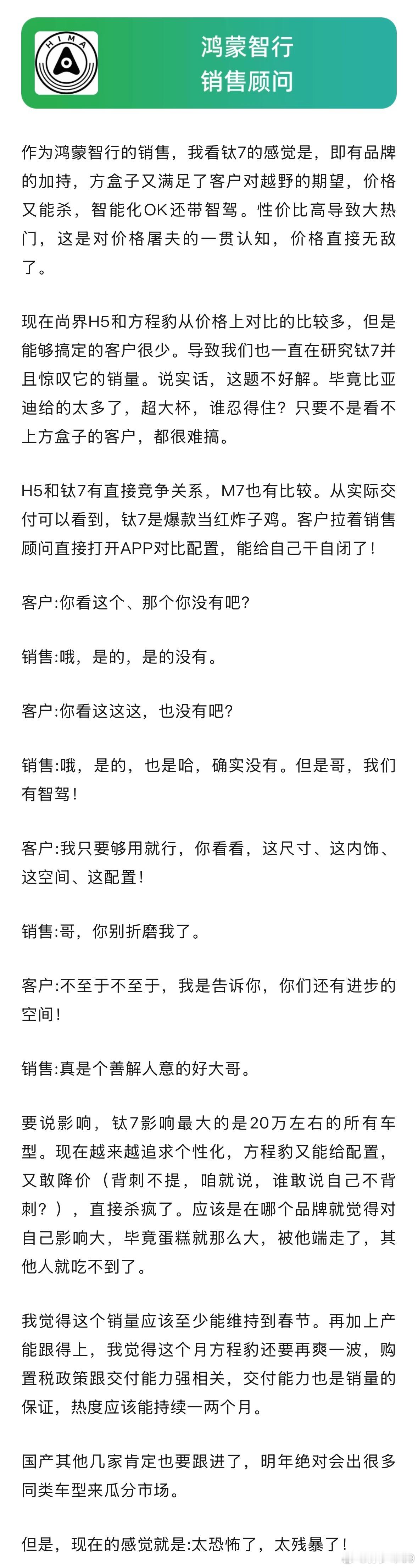 方程豹钛7在11月卖了2万4千台,其实大家都很想知道,火爆的背后究竟影响到哪些品牌。所以找了5位一线销售小伙伴聊聊,看看实际情况究竟怎么样新能源汽车