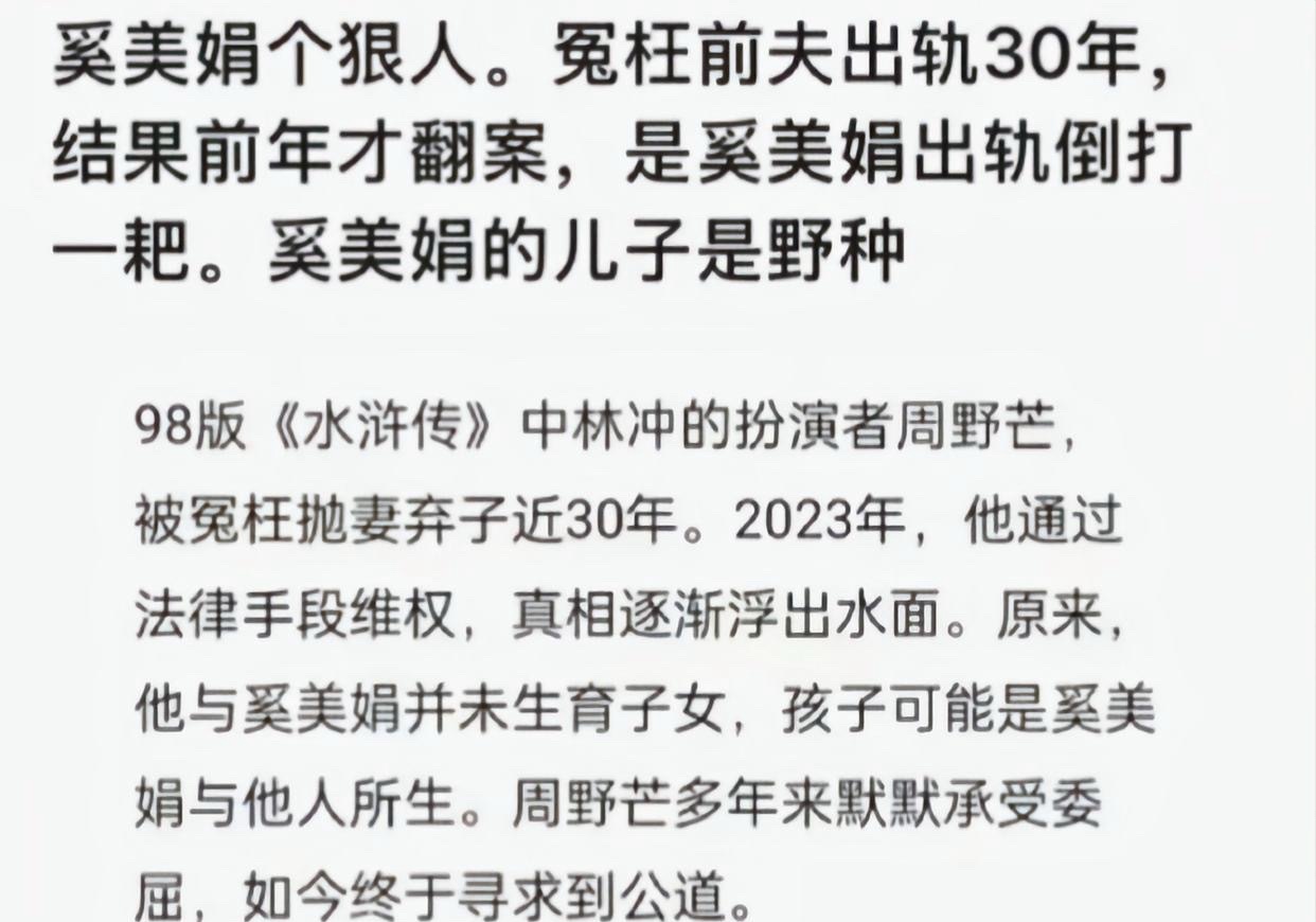 奚美娟晚节不保?她演过很多经典角色,与前夫周野芒在1994年离婚,那时她给人的感觉很悲惨,曾饰演过林冲的周野芒也背负上“出轨抛妻弃子”的骂名!意外的是周野芒一直到2024年才打赢官司,奚美娟所生的孩子与他没有血缘关系!原来奚美娟是带娃嫁给他啊!奚美娟昔日美好形象一下子“坍塌”了!