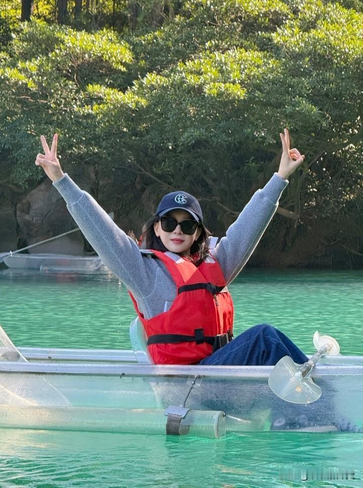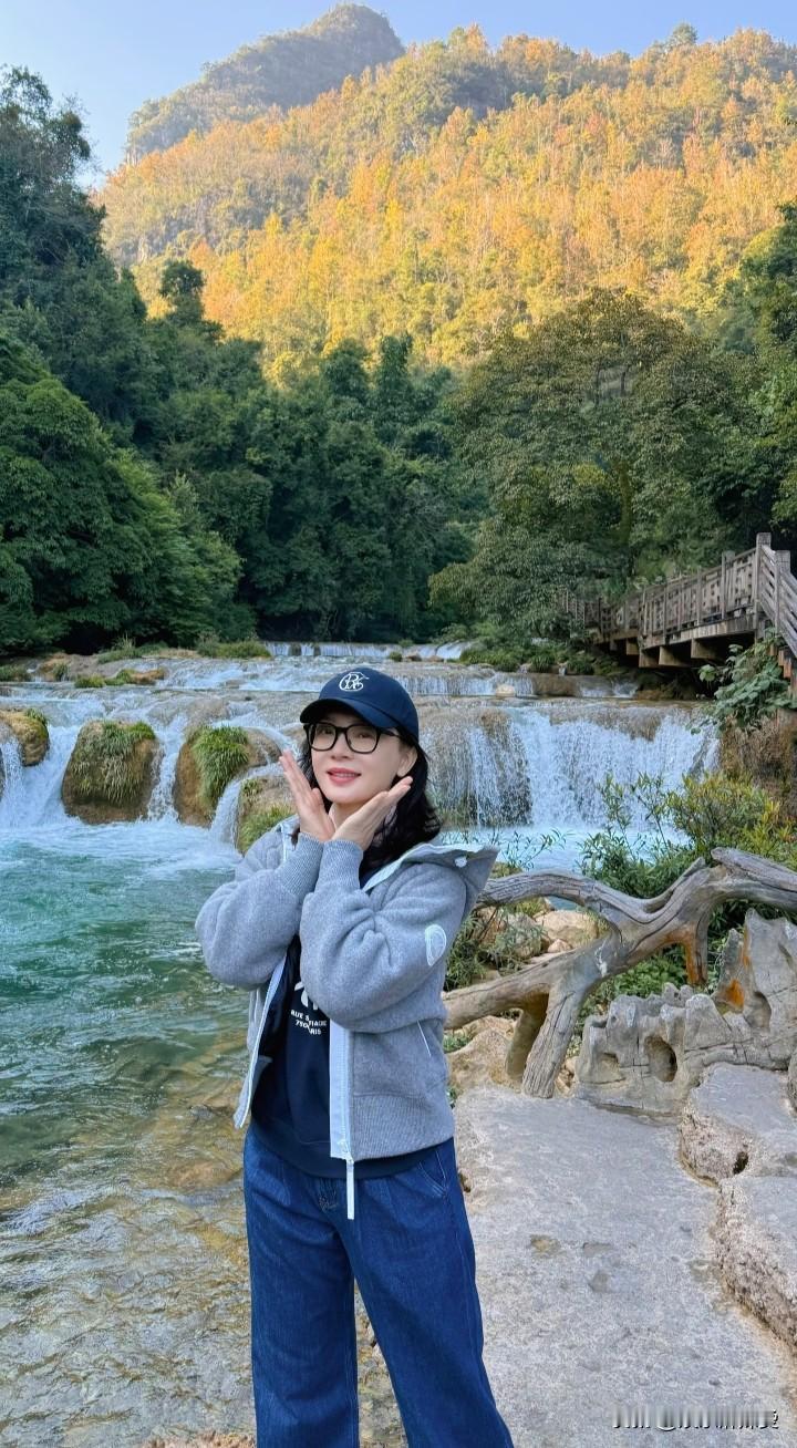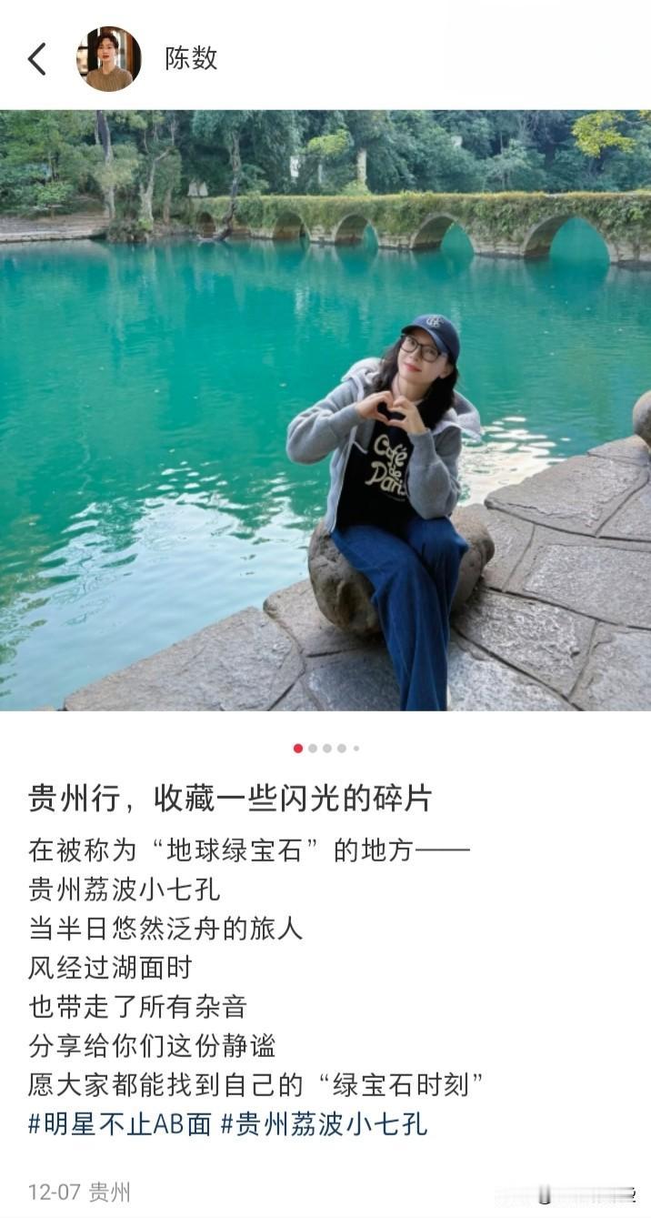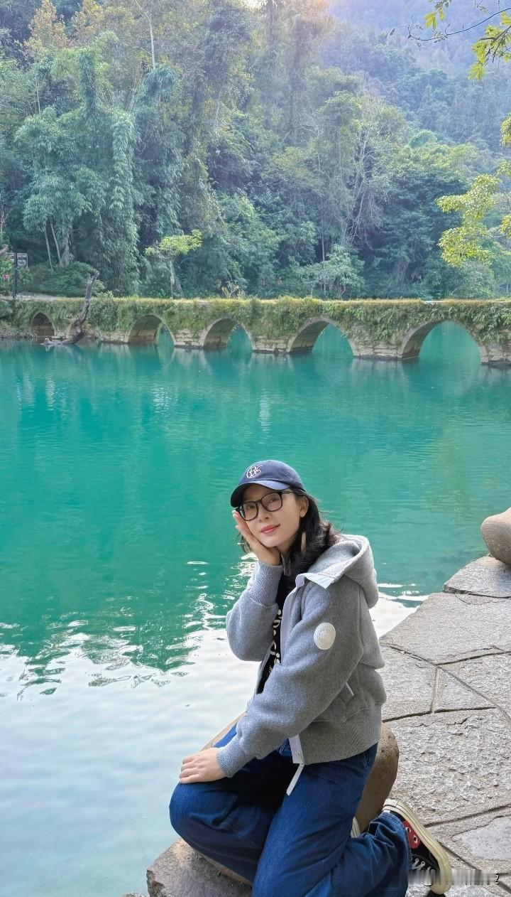 多读书还是有好处的,特别是公众人物就应该多读书,48岁女演员陈数不愧是出过书的人,她的文字真的让人身临其境,代入感很强,她不当全职作家可惜了。 近日,陈数在贵州荔波小七孔游玩,只见她戴着文艺眼镜和鸭舌帽,穿着素静的卫衣外套和休闲牛仔以及休闲鞋,邂逅在依山环绕碧绿的静湖边,坐在石头上,换着姿势打卡拍照,从远处望去,她就像一名知识女青年,纯粹而洒脱,她乘一叶扁舟,荡漾在湖面上,唯美而又酷炫。 特别是她写的文案,堪比广告宣传文案,让人身临其境,心之神往而慕名而来,可见她平时爱阅读,所以下笔如有神,这在娱乐圈甚是少见。