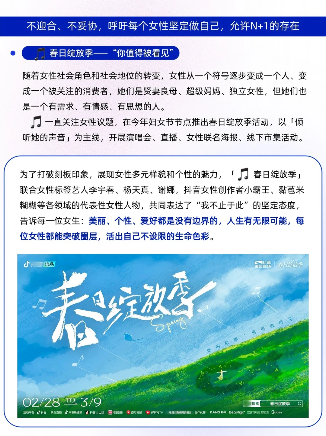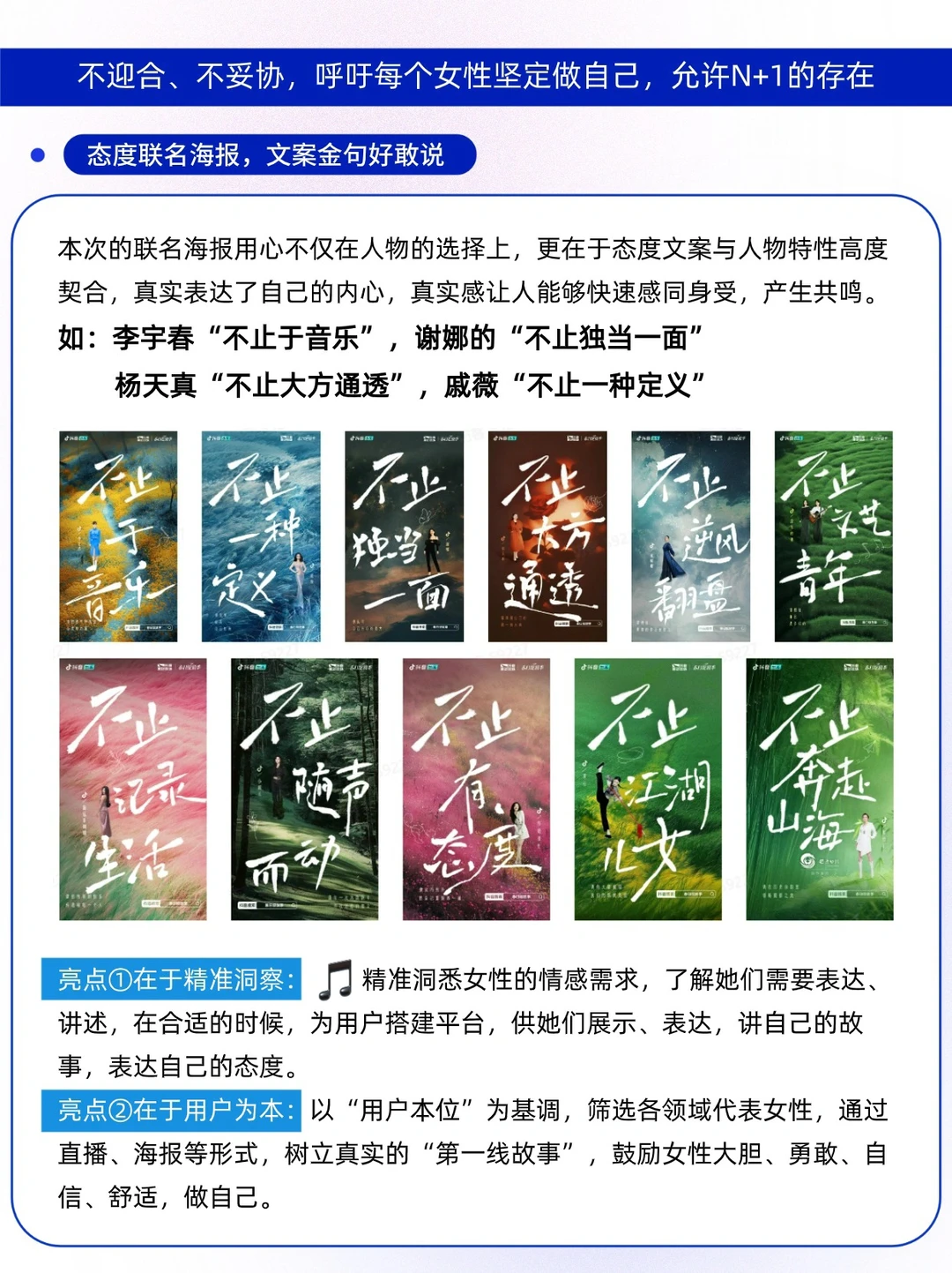 如果让你用一句话来打破对女性的刻板印象,描述“不被定义”的课题,你会怎么写?✍🏻 在三八妇女节的节点,D🎵以一场春日绽放季主题活动,联合女性标签艺人李宇春、杨天真、谢娜等各领域的代表性女性人物,发布了11张态度海报,聚焦女性「倾听她的声音」🌸 打破刻板印象,描述不被定义⬇️ 可以“不止独当一面”的谢娜 是“不止于音乐”的李宇春 是“不止大方通透”的杨天真 表达的是“我不止于此”的坚定态度 传达出了“有无限可能”的精彩人生 是美丽、个性、爱好没有边界的你 是芸芸众生中不被设限的“她” 🔵IP营销并不是自说自话,而是从IP核心理念出发,真实共情用户,通过用户本位,深入观察和理解用户完整的生活模式,让用户成为主角,用N个真实用户的“原生情绪触点”来撬动N个目标用户,从而实现IP与用户的深度沟通,使用户对活动产生认同和共鸣。 D🎵春日绽放季这场营销活动,与其定位强契合,让每一个人看见并连接更大的世界,鼓励表达、沟通和记录,激发创造,让现实生活更美好,真的有被狠狠共情到👍🏻