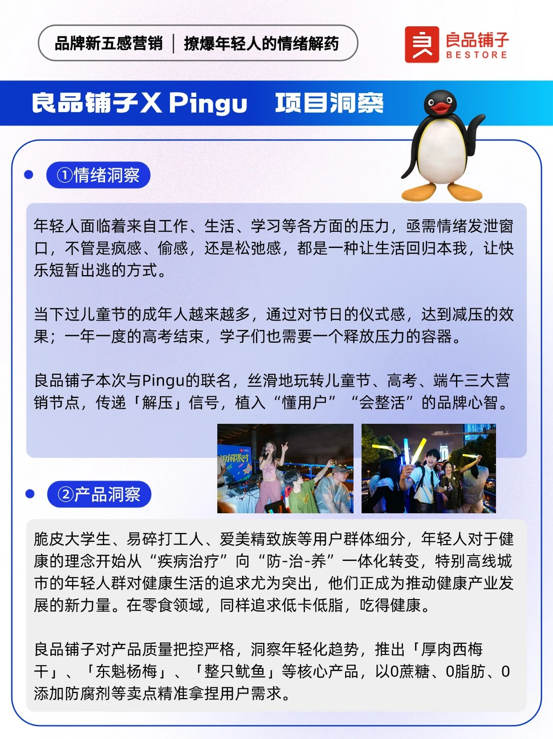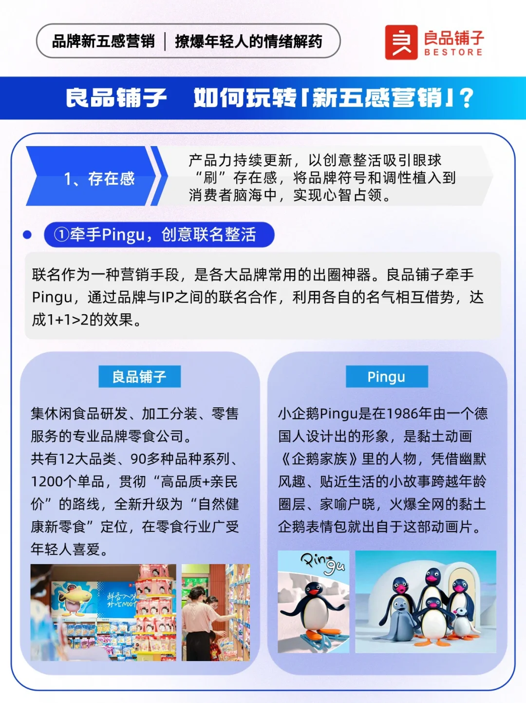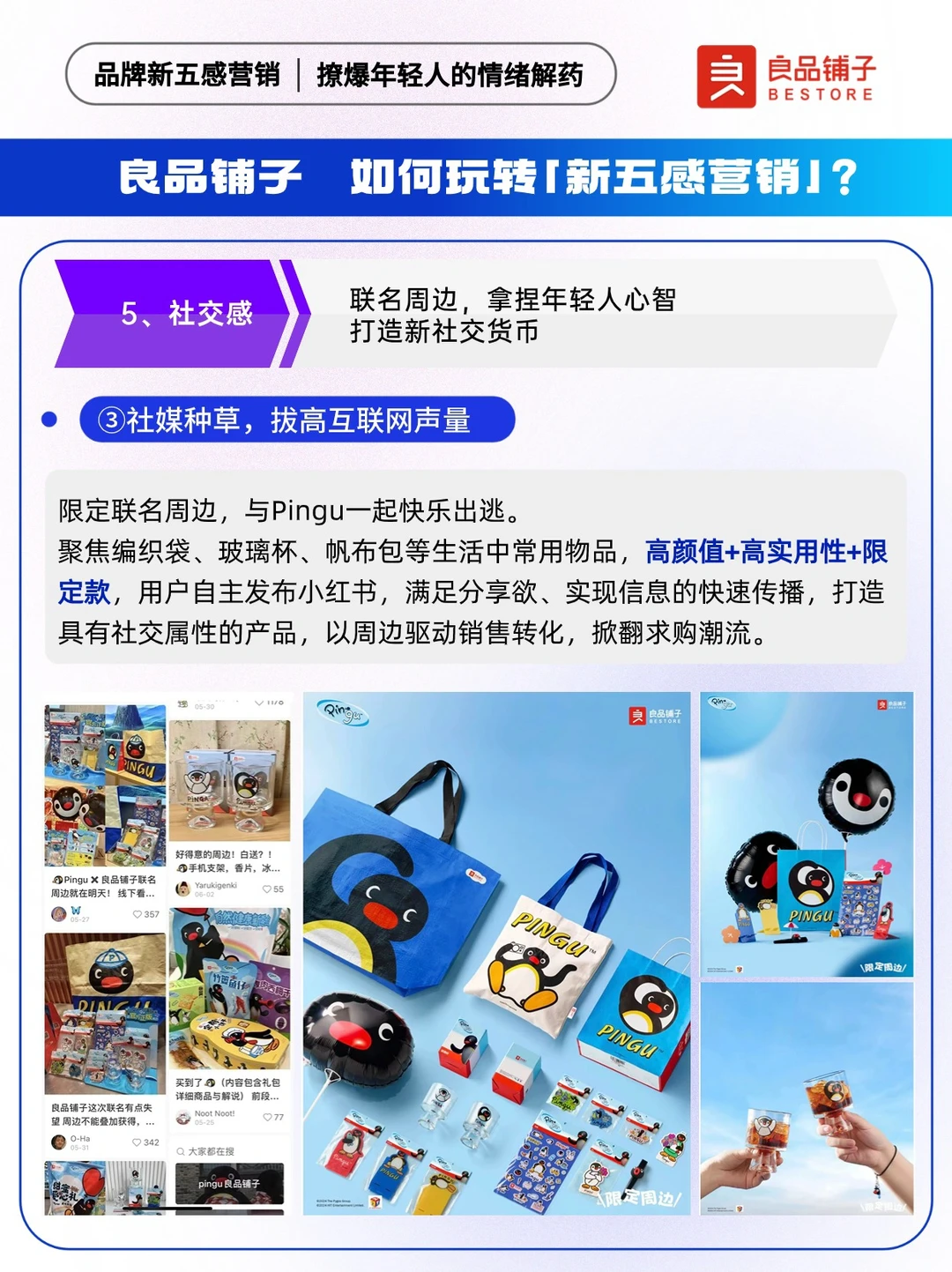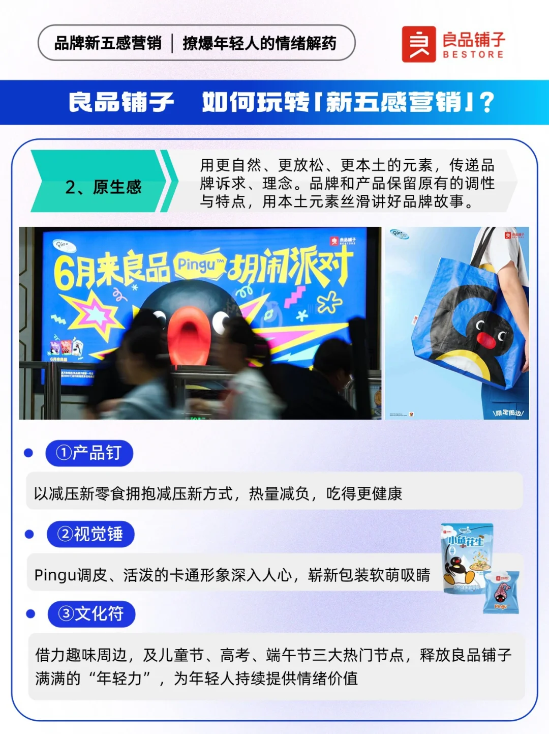 📍“传统五感”是指通过刺激消费者的视觉、嗅觉、味觉、听觉以及触觉,链接用户与品牌。伴随消费者需求迭代,品牌“新五感”应势而生,反映了年轻消费群体对市场、品牌、产品的新需求。 联名作为一种营销手段,是各大品牌常用的出圈神器。 ✅以自然健康新零食为全新品牌价值主张的「良品铺子」,牵手「Pingu」,通过品牌与IP之间的联名合作,以品牌情绪力为突破口借周边,及儿童节、高考、端午三大热门节点,释放良品铺子满满的“年轻力”,用本土元素丝滑讲好品牌故事,为年轻人持续提供“放肆好吃”的情绪价值。 🐧让我们来看看良品铺子X Pingu,是怎么玩转新五感营销~ 🔵本期内容速览: ①良品铺子如何玩转新五感营销? ·存在感 ·原生感 ·氛围感 ·松弛感 ·社交感 ②项目背景洞察 ·情绪:压力出逃 ·产品:健康生活 ③品牌新五感营销启示: ·拥抱年轻人就是拥抱未来市场 ·上半场卷产品,下半场卷产品+情绪 ·注重节点营销布局,放大用户感官体验