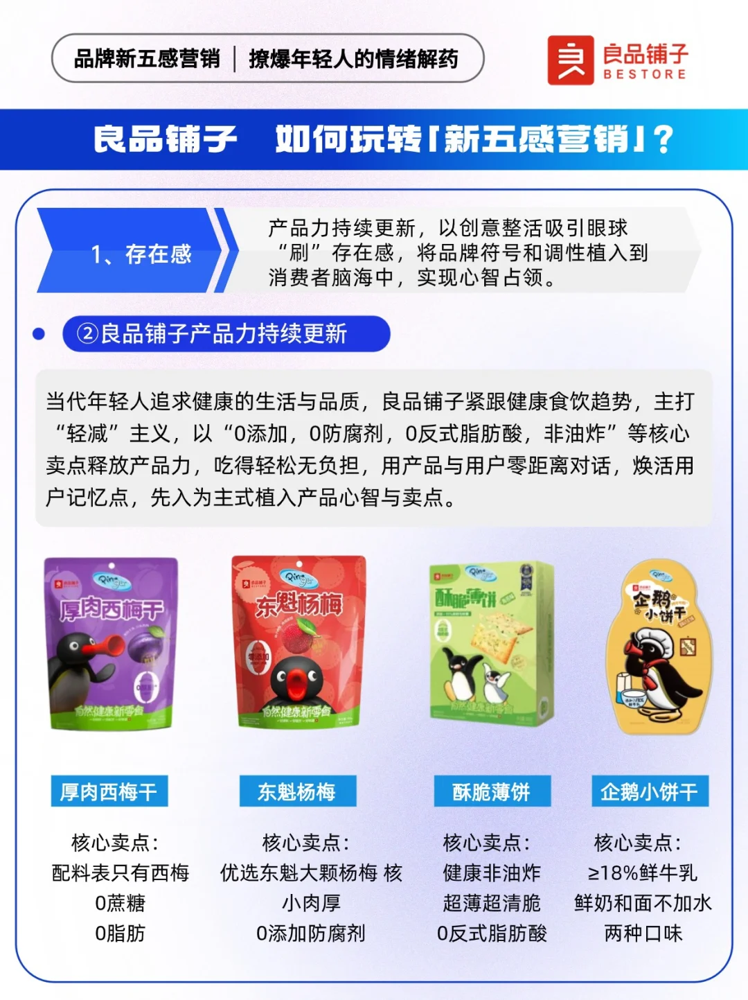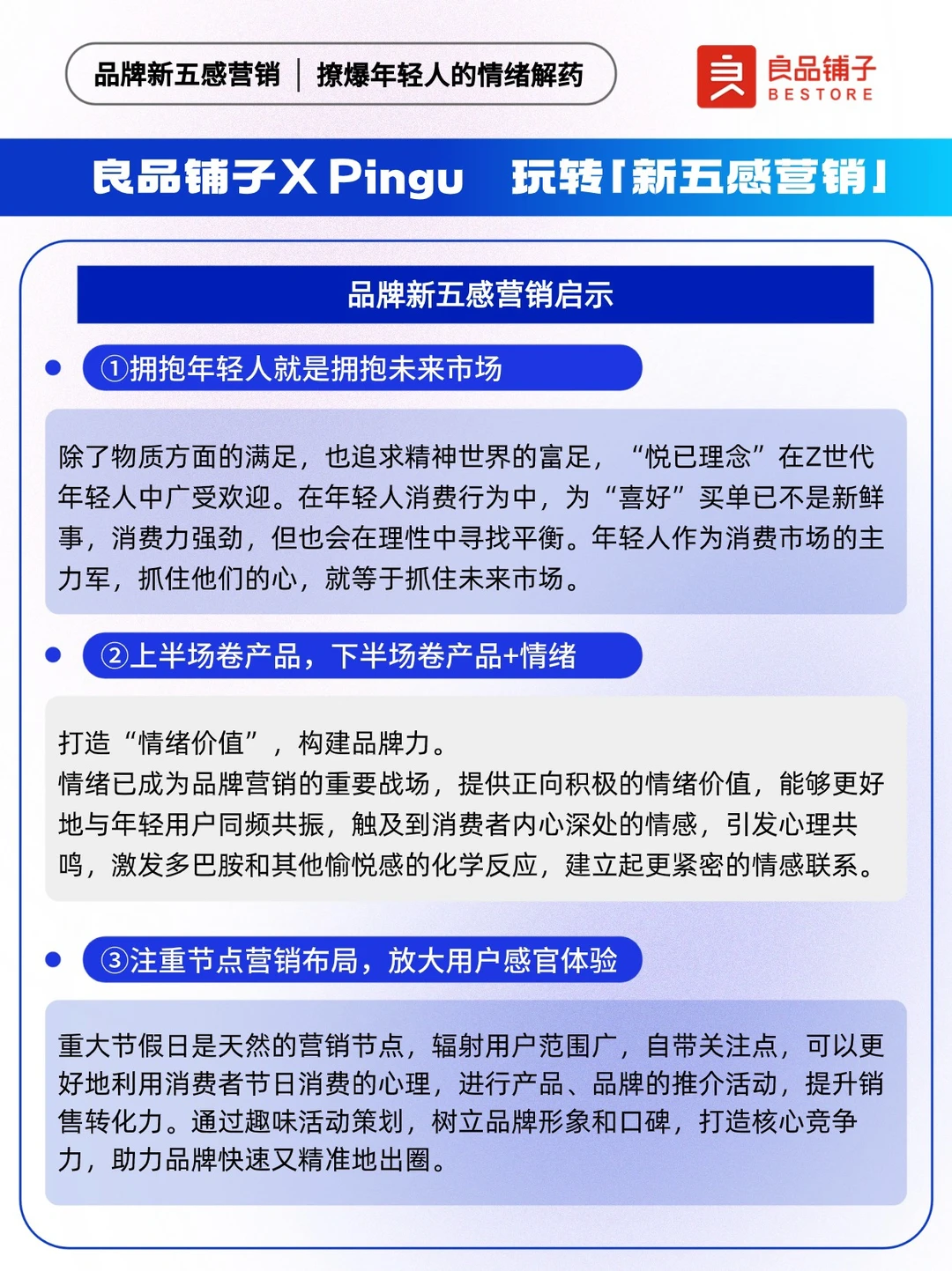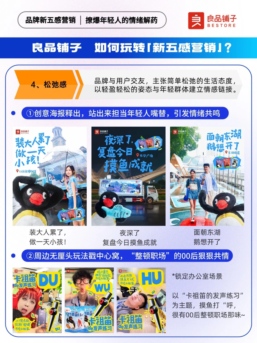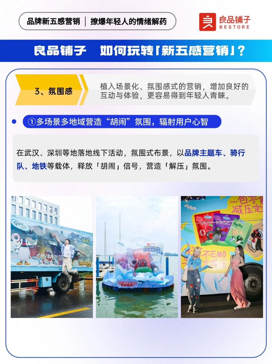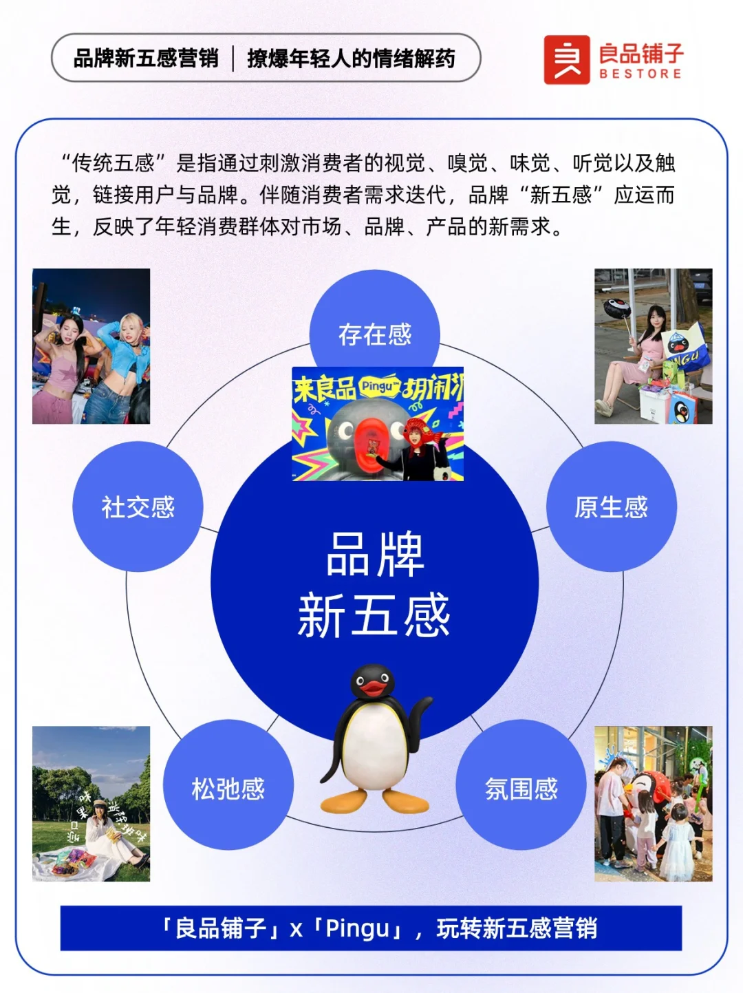 📍“传统五感”是指通过刺激消费者的视觉、嗅觉、味觉、听觉以及触觉,链接用户与品牌。伴随消费者需求迭代,品牌“新五感”应势而生,反映了年轻消费群体对市场、品牌、产品的新需求。 联名作为一种营销手段,是各大品牌常用的出圈神器。 ✅以自然健康新零食为全新品牌价值主张的「良品铺子」,牵手「Pingu」,通过品牌与IP之间的联名合作,以品牌情绪力为突破口借周边,及儿童节、高考、端午三大热门节点,释放良品铺子满满的“年轻力”,用本土元素丝滑讲好品牌故事,为年轻人持续提供“放肆好吃”的情绪价值。 🐧让我们来看看良品铺子X Pingu,是怎么玩转新五感营销~ 🔵本期内容速览: ①良品铺子如何玩转新五感营销? ·存在感 ·原生感 ·氛围感 ·松弛感 ·社交感 ②项目背景洞察 ·情绪:压力出逃 ·产品:健康生活 ③品牌新五感营销启示: ·拥抱年轻人就是拥抱未来市场 ·上半场卷产品,下半场卷产品+情绪 ·注重节点营销布局,放大用户感官体验