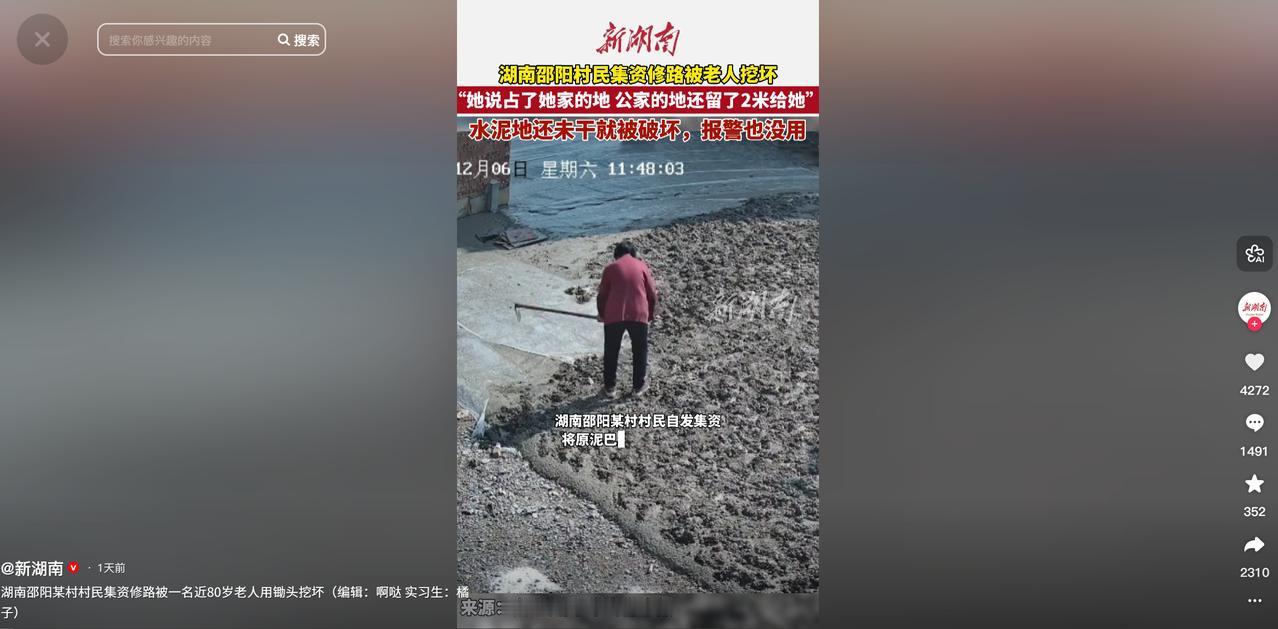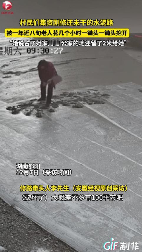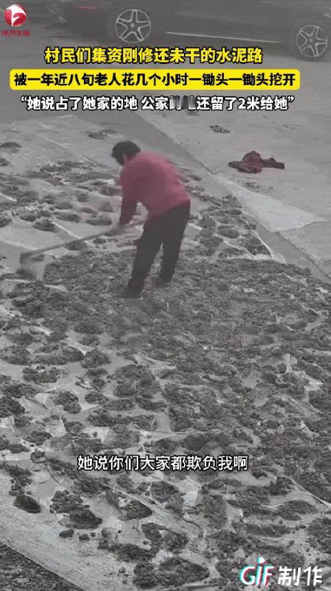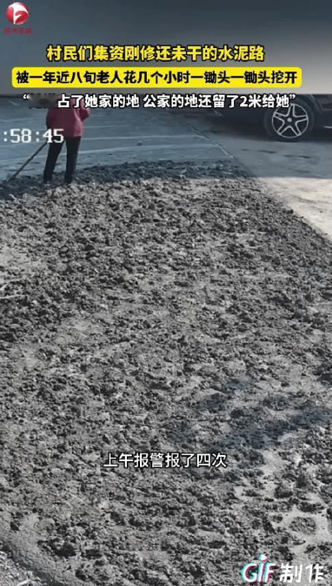“这下解释不清了!”湖南邵阳,一村里集资修了条水泥路,眼看就有要平整的好路了,结果还没等水泥干,就被一位大妈给恶意挖掉了,有村民表示:这是公共的路面,但她却说是自己家的地,已经报了四次警 这路修得有多不容易,只有村里人自己知道,以前村里的路就是典型的 “晴天一身灰,雨天一脚泥”,每逢下雨,烂泥能没过脚踝,老人小孩出门都得小心翼翼,稍不注意就会摔跟头。 为了修这条路,村民们盼了好几年,今年终于下了狠心众筹,经济条件一般的,一人掏 50 块,手里宽裕点的家庭,直接拿出 500 块,还有非本村的大妈,虽然没出钱,也清楚这条路对周边出行的重要性,大家伙儿一分一厘把钱凑齐,好不容易盼到水泥倒下去,眼看着平坦的新路就要成型,谁也没想到会出这么一档子事。 动手挖路的大妈已经 80 多岁高龄,可那精气神和劲头,真不像耄耋之年的老人,12 月 6 日早上 9 点半,她扛着锄头就直奔还没干透的水泥路面,二话不说就开始刨挖,那一下下的力度,看得旁边村民心疼不已。 有人无奈地调侃,估计老太太这辈子下地干活,都没这会儿这么带劲,每一锄头下去都透着股狠劲,仿佛要把心里的怨气全撒在路面上,就这么一直干到中午 12 点多,整整两个半小时,100 来平米的铺装路面,被她一锄头一锄头毁得干干净净,原本平整的水泥地,变成了坑坑洼洼的烂泥地,村民们看着自己的心血付诸东流,心里别提多堵得慌了。 矛盾的核心就卡在这路面底下的土地归属上,大妈一口咬定修路的地方是自家的地,所以她想挖就挖,完全没觉得自己做错了,可村民们却不认同这个说法,据大家伙儿介绍,大妈家确实有处老宅在附近,但那是没人住的空宅子,离修路的地点还有大概 15 米的距离。 而且施工之前为了照顾老人的情绪,避免产生纠纷,村民们已经特意做出了让步,给她们家那个方向预留了 2 米宽的空地。可在大妈看来,这远远不够她觉得路一修就占了自家的便宜,是在欺负她们孤儿寡母,所以才想出了挖路的法子。 最让村民们感到无力的,是这四次报警都没能彻底解决问题,每次警察接到报警赶来,闪着警灯停在路边,大妈就很识时务地停下锄头暂时歇手。 可只要警察一离开,她立马又扛起锄头接着挖,这一出一停的 “游击战”,把村民们折腾得没脾气,毕竟大妈年纪大了,按照法律规定,就算她的行为再偏激,也没法对她进行拘留,村民们更是不敢硬拦,生怕万一有个磕碰摔倒,到时候反倒有理说不清,自己还得承担责任。 其实仔细想想大妈家的老宅早就没人住了,就算这条路修好了,不管她家人以后住不住,房产周边的环境都会实打实得到提升,对她来说也是件好事,可现在因为这说不清道不明的土地权属问题,不仅路被毁掉了,邻里之间的情分也闹得很僵。 如果真像大妈说的那样,修路的地方确实是她的私有土地,那事先没谈拢赔偿或者置换,确实是占用了她的私人资源,农村人把土地看得比命还重,她气不过挖路虽然偏激,但逻辑上也能让人理解几分,可要是如村民所说,这就是公家的路口,是公共用地,那大妈的行为性质就变了,仗着年纪大就无视公共利益,毁掉全村人的心血,这就有点说不过去了。 现在这事儿就这么僵着,那 100 平米的烂泥地像块伤疤一样晾在村里,后续的烂摊子怎么收拾,真挺考验人的。光靠报警抓现行肯定没用,关键还得把土地权属弄清楚,乡镇政府得把地籍图纸拿出来,一尺一寸地丈量,到底是公家的路口还是私人的自留地,用事实说话。 要是真占了大妈家的地,该给的青苗费得给,该道歉的得道歉,把事情说开,要是大妈纯属无理取闹,那由此产生的经济损失,也不能因为她 “年纪大了” 就让全村集资的好心人买单,该承担的民事赔偿责任,总归是逃不掉的,经这么一闹路是烂了,可大妈一家人在村里的名声,恐怕比这烂掉的水泥路还难修补回来。