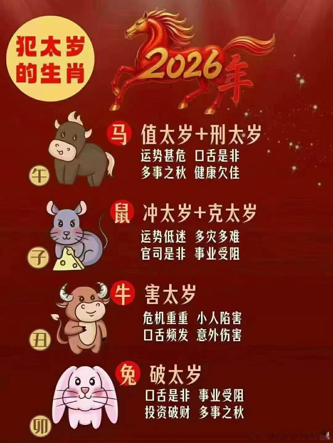 2026年犯太岁的四个属相分别是:马,牛、兔、鼠,每天化解 可以预约六个名额,及时的安排化解妥当,为开始26年的新运程开运转运[合十][合十][合十]