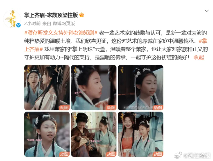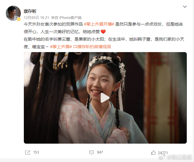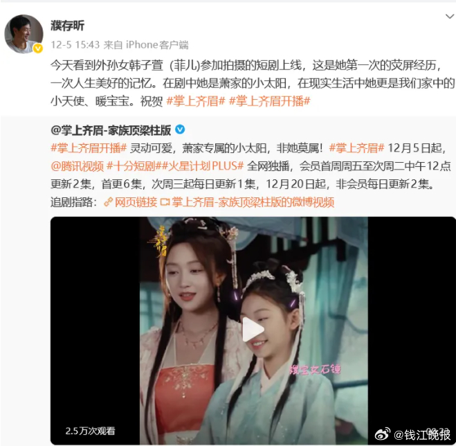 【演员濮存昕发文支持外孙女演短剧:我们家的暖宝宝,为她点赞!剧方回应】#濮存昕外孙女出道# 近日,著名演员濮存昕发文支持勇闯短剧圈的外孙女:“外孙女首次参加的荧屏作品《掌上齐眉》开播,虽然只是参与一点点戏份但是她说很开心,人生一次美好的记忆给她点赞!在剧中她的名字叫萧云萱是萧家的小太阳,在生活中她叫韩子萱,是我们家的小天使暖宝宝。”据悉,12月5日,濮存昕连续发文支持外孙女,并点赞其出演短剧的微博。没想到,评论区网友意见不一,有人劝其试试其他行业。相关话题登热搜后,引发大批网友讨论。12月9日,剧方发文回应:“老一辈艺术家的鼓励与认可,是新一辈对表演的纯粹热爱的温暖土壤。我们欣喜见证,这份对艺术的赤诚在家庭中温馨传承。戏里萧家的‘掌上明珠’云萱,温暖着整个萧家,也让大家对家族和正义的守护更加有动力~隔代的支持,是温暖的传承,一起守护这份初绽的美好!”目前,濮存昕方面未就此事作出公开回应。公开资料显示,濮存昕,1953年7月31日出生于北京市,中国内地男演员、一级演员。1988年因拍摄影片《最后的贵族》而步入影视圈,这也是他首次在电影中演男主角;1996年,因在公安题材电视剧《英雄无悔》中饰演公安局长高天,被更多观众认可与喜爱;2000年,凭借电影《洗澡》获第7届北京大学生电影节最受欢迎男演员奖;2005年,因出演电影《一轮明月》获第25届中国电影金鸡奖最佳男主角奖提名、第11届中国电影华表奖优秀男演员奖。(来源:九派新闻、中国蓝新闻、公开资料等)