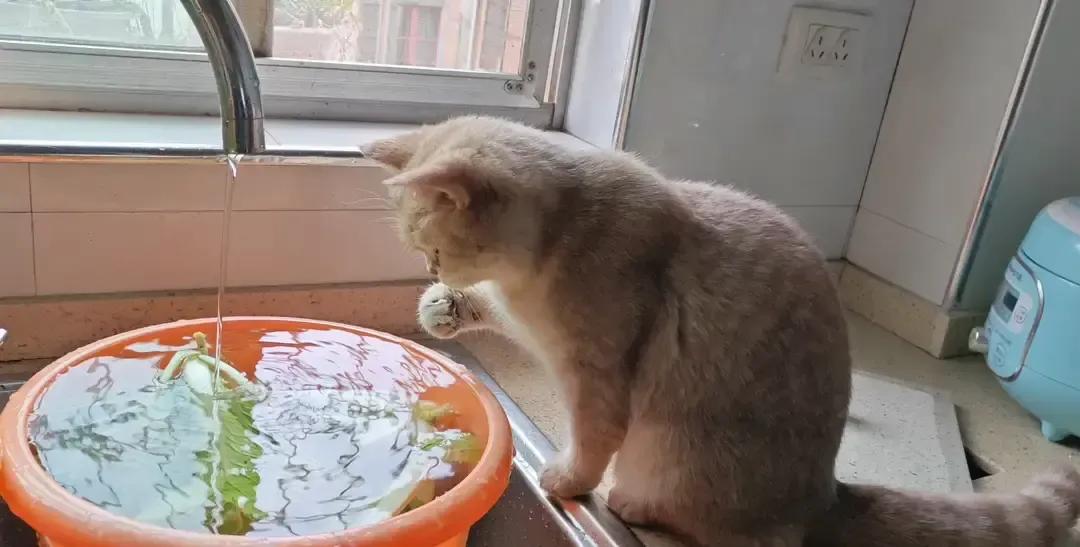 小老虎跳上灶台玩水那段我刷到三次,每次都被治愈。 4月4号上午,主人在洗菜,它轻