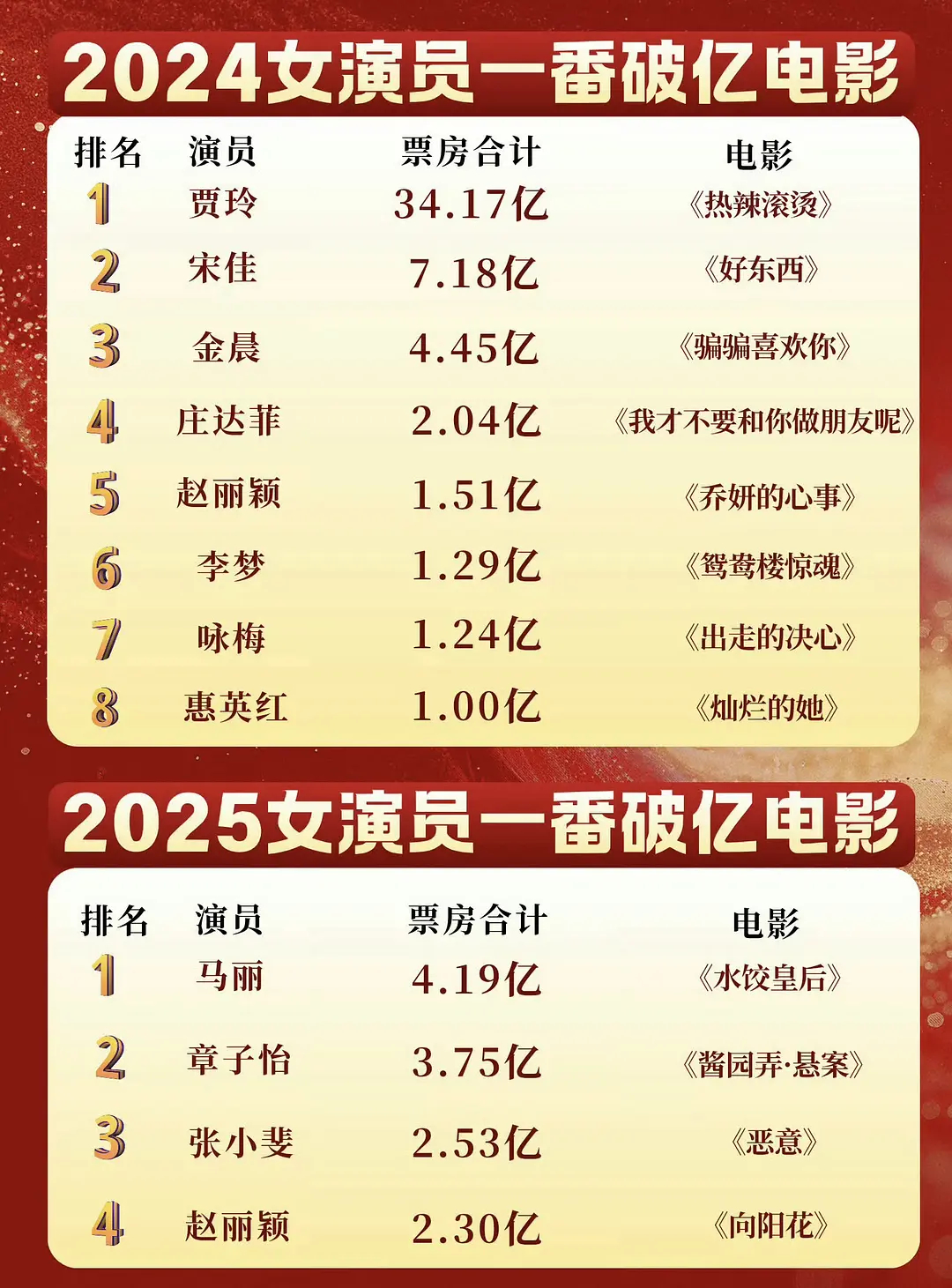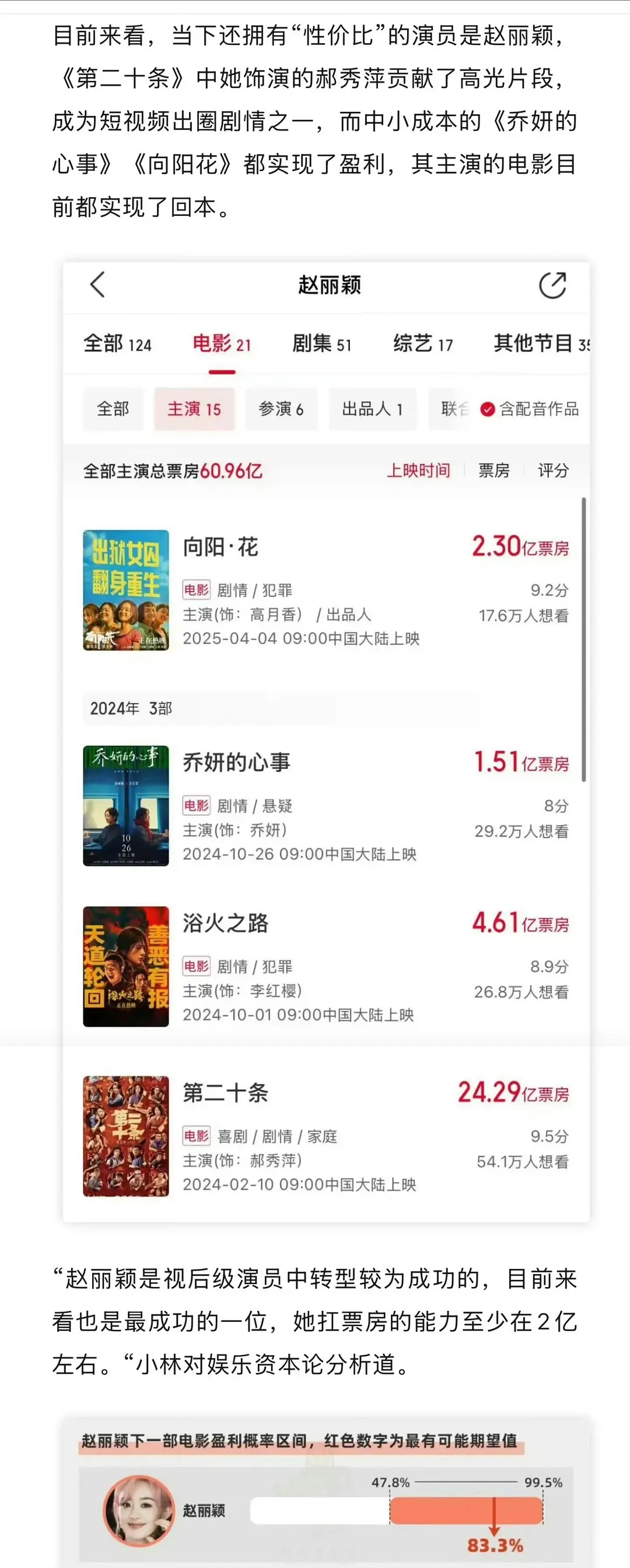 赵丽颖唯一一位2024、2025年连续两年票房破亿的女演员🔥 恭喜🎊!两部小成本电影和了了巨大的盈利!恭喜🎊!2024-2025赵丽颖主演的4部电影不分档期均破亿盈利!电影《向阳·花》清明档票房冠军!春节档过后首部破2亿的电影!!!业内认证的每部都赚!!!均上财报获得业内认证!太牛了👍!让我们恭喜这位获得2025票房号召力女演员TOP1的赵丽颖!