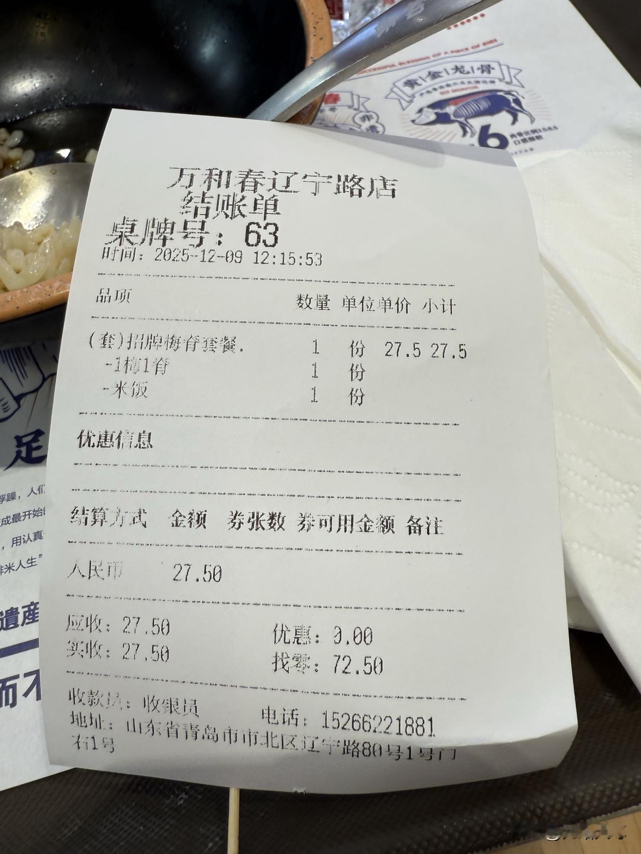 我昨天中午12点多了想回家吃饭了,就坐上了公交车回家的路上突然想吃排骨米饭了,青岛有个名小吃万和春排骨米饭,我吃过很多次这家的饭挺好的,这个464路车正好去青岛科技街上有一家店,我去了这个品种就剩下一份了我交钱去找坐位坐下了,很快就送过来了,我还买了小瓶的泸州老窖16元开始吃饭了,这期间我看到的最多的就是外卖小哥进进出出忙着送餐服务,我从来没有点过外卖,我以后就点这个排骨米饭,原创。