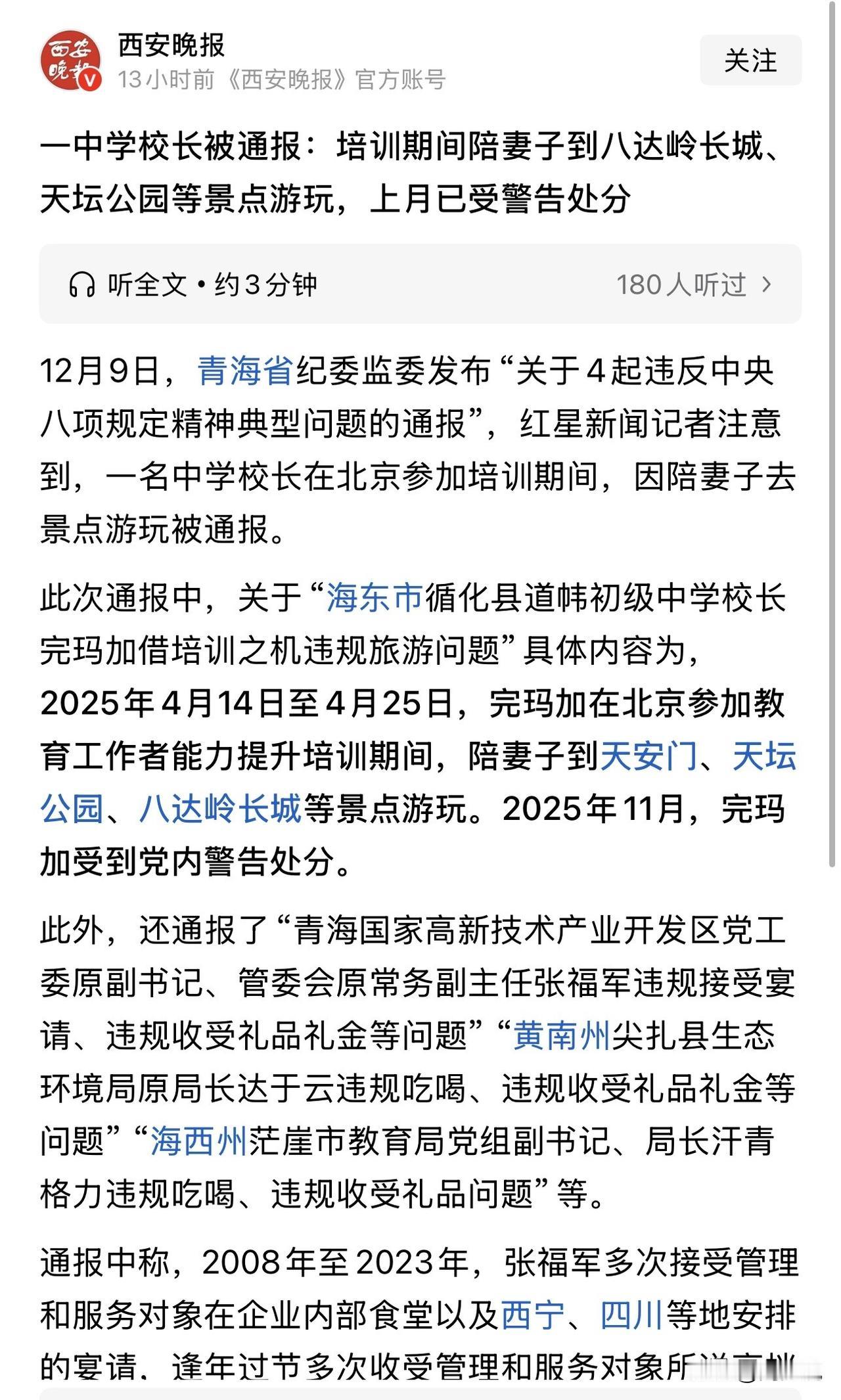真是咎由自取啊!一中学校长被通报,北京培训期间陪妻子到天安门、八达岭长城、天坛公园等景点游玩,受到警告处分! 看完这个通报,其实让人有一点不理解,主要是有两个方面没有核实,一是占用培训时间没有,二是是否公费。这一点很关键,如果都占了,那受警告处分不为过,大家觉得呢?#寻美三湘# #长沙新朋友#