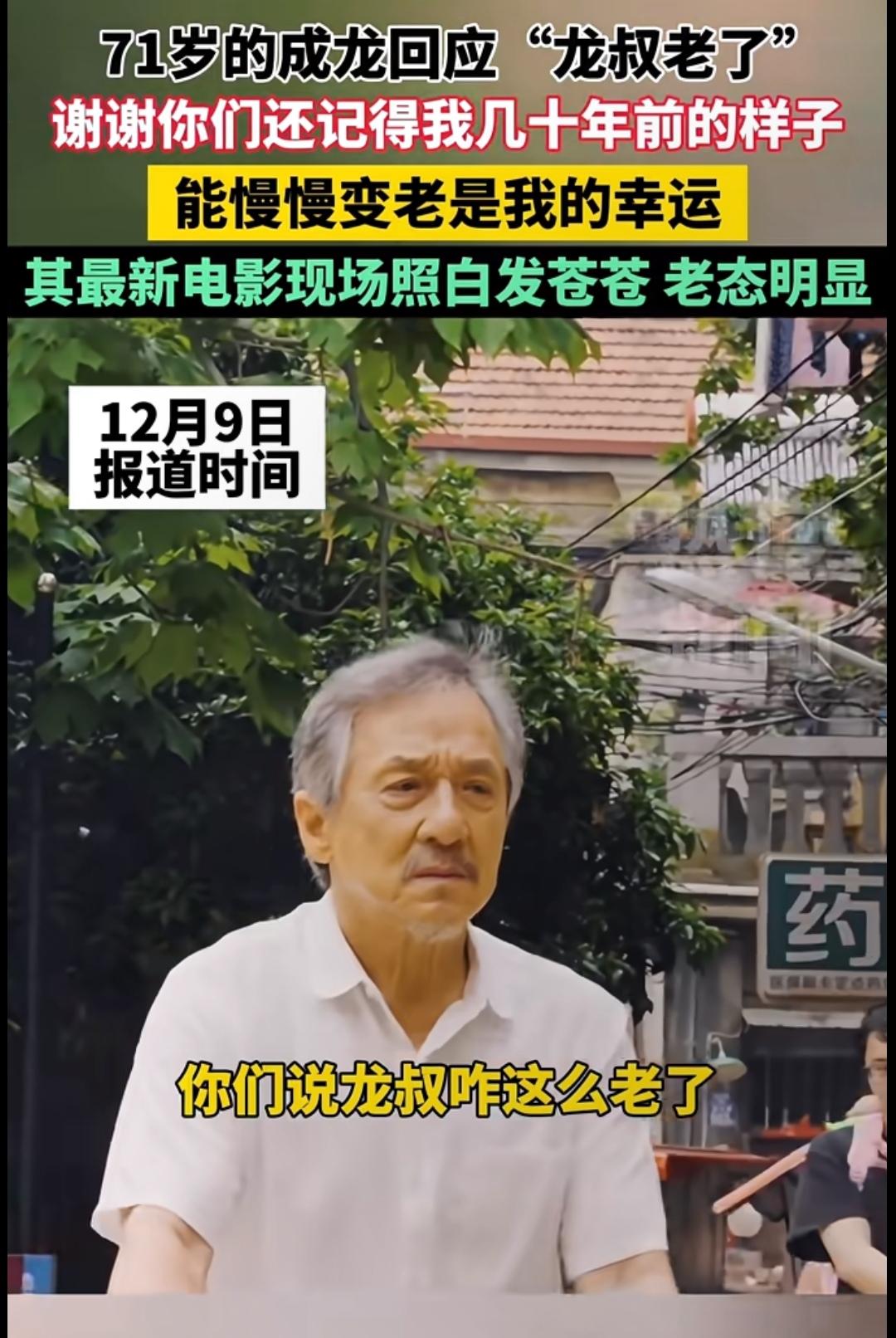 71岁的龙叔回应老了,谢谢你们还记得我几十年前的样子。听了龙叔这么说,有点感慨说不上来是什么感觉!出彩的还是几十年前的电影,电影数量多笑点足,大家成批看也是看那个时代的电影。2010-2025的新电影看的人也不如看以前的多,印象都不深。看回现实的成龙不就感到巨大的反差。现在你问十几岁的小孩,看没看过成龙的电影,他们的回答一定出乎你的意料之外。一代人有一代人的偶像。我们那时候看,醉拳,A计划,快餐车,尖峰时刻,城市猎人,新警察故事,神话,宝贝计划…太多太多经典电影,带给我们无数欢乐时刻,致敬龙叔!