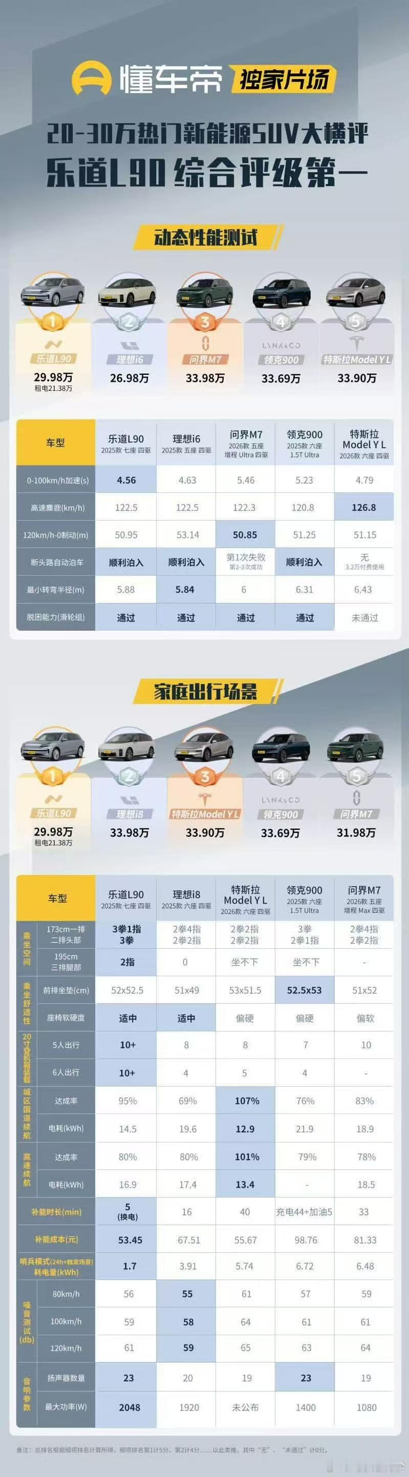 这种对比也挺搞笑的,标题是20-30万热门新能源 SUV 对比。如果不看价格还算是热门吧,但:第一项拉出个 Model YL 就已经远超30 万了。非要强行对比,保持统一也行吧。第二项又把 i6 换成了 i8。如果说这时候又想对比凸显某些六座车,那你问界 M7 又搞成四座又怎么回事。