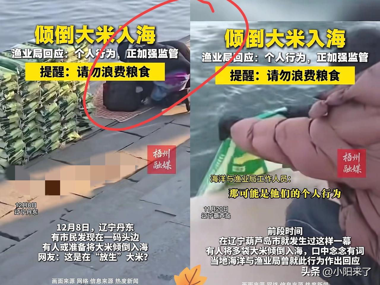 “人不能吃得太饱!”辽宁丹东,几个女子将50袋大米摆放在江边,对着江面下跪磕头,一套“祈福”流程走完,竟直接把满袋大米全倒进江里! 这哪里是积德行善,分明是拿着粮食造孽,打着放生的幌子干着破坏的事! 警方回应不违法但坚决不鼓励,这话算是留了情面。可但凡有点常识都知道,这不是放生是“放祸”! 农民起早贪黑种出的大米,被她们当垃圾一样倒进水域,泡烂后会耗尽水中氧气,鱼虾活活缺氧死,还会滋生细菌、释放毒素,搞不好引发污染,好好的江域生态全被搅乱! 更可笑的是,她们以为跪拜倾倒就是积德,却不懂真正的善良从不是自我感动的形式主义! 有买50袋大米的钱,不如捐给吃不饱饭的家庭、帮扶困难老人,让粮食落到实处,比对着江水磕头有意义一万倍! 反食品浪费不是口号,更不是让某些人拿来当“祈福道具”的借口。这种打着行善旗号的浪费和破坏,真的该被狠狠抵制! 海里倾倒大米