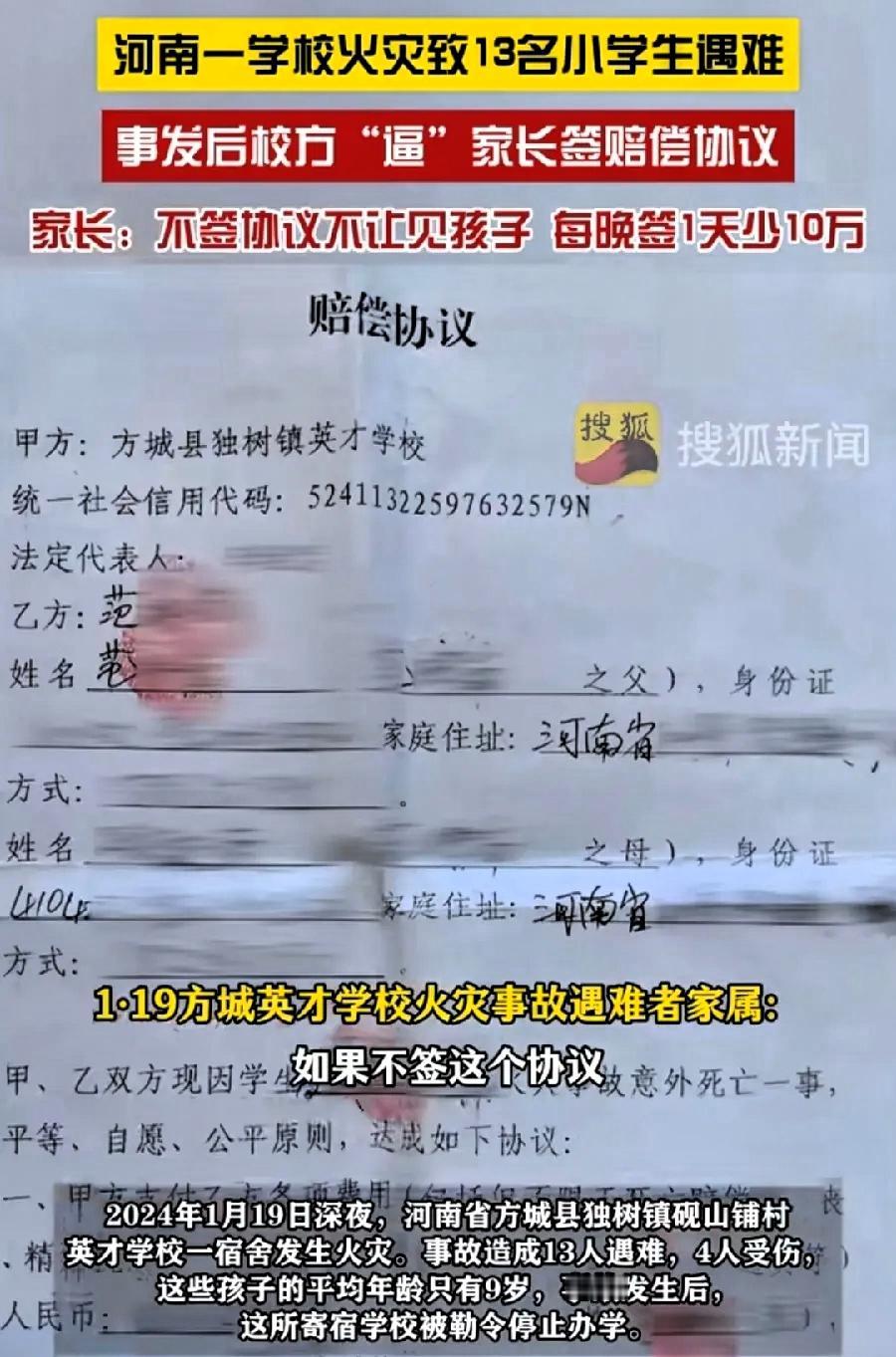 方城火灾赔偿,范啸楠爸爸曾透露,每个学生赔了约130万,拿了钱不能再追究,如今逼签协议曝光 如今几位家长宁可冒着退钱的风险,也要曝光这份协议,只因当初签字并非为了钱财,而是不签就见不到孩子最后一面,这份无奈背后满是心酸。 在家长们心中,这130万从不是能抚平伤痛的抚慰金,而是孩子用生命换来的“命钱”。范爸爸直言这笔钱一分未动,毕竟那是孩子留在世间的最后关联,任谁都不忍心动用这份带着血泪的款项。 除了范爸爸,还有几位孩子的爷爷也站出来发声,这些孩子大多由爷爷奶奶带大,爷孙感情深厚,白发人送黑发人本就是人生至痛,何况孩子离世的情形还格外惨烈,还要被协议限制不能追问真相,这份委屈和悲痛实在难以承受。 范奶奶的执念更让人揪心,范爸爸一家为了走出伤痛选择搬家,可范奶奶却执意留下,她说怕孩子回家找不到家人。 这不是对房子的眷恋,而是一位老人对孙辈最朴素也最刻骨的牵挂,是失去孩子后仅剩的精神寄托。 家长们的诉求其实很纯粹,他们并非贪图更多赔偿,也不是想刻意制造事端,只是希望相关责任能得到依法认定和处理,给逝去的孩子一个清晰的交代。 金钱能解决很多事,却填不满失去至亲的心理缺口,比起钞票,一个公正的结果才是对孩子和家庭最基本的告慰。