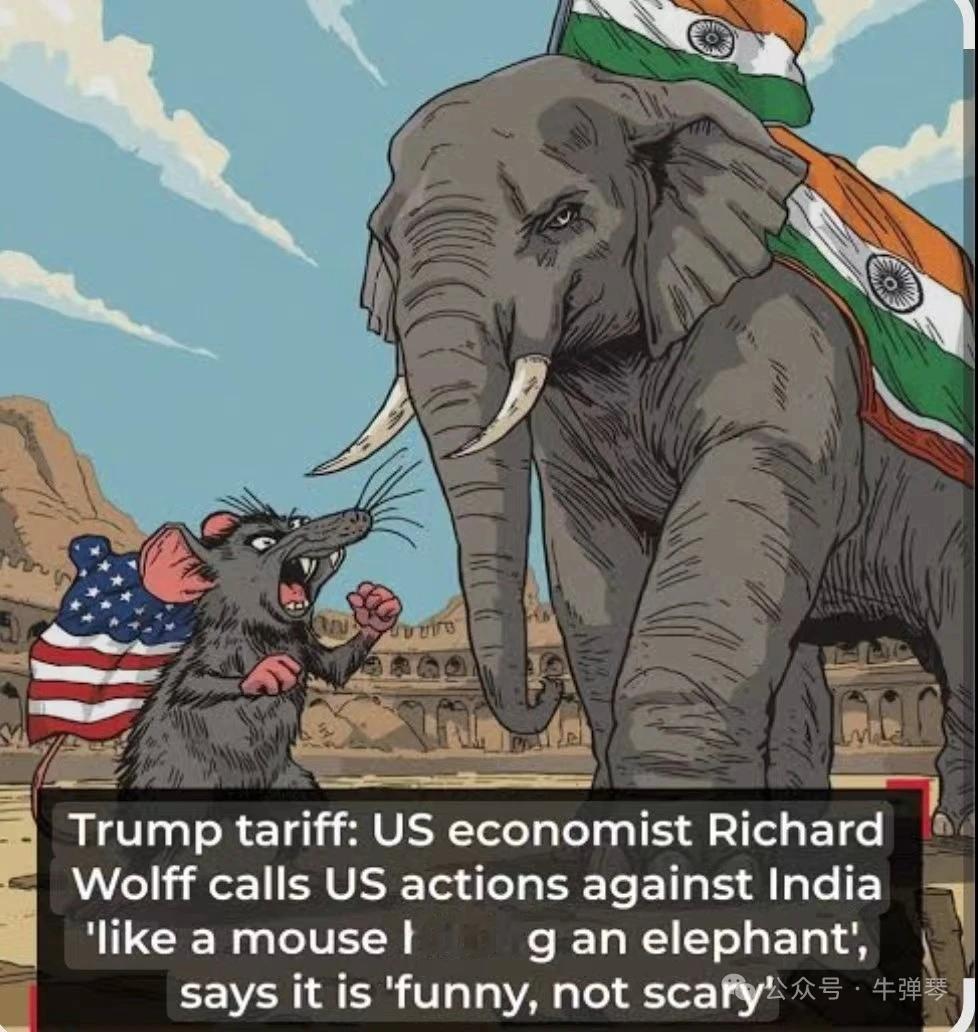 牛弹琴发了一张图,让中国网友笑不活了!原来,特朗普对印度征收了高额关税,印度网友怒了,直接画了一幅“老鼠打大象”的图,并配文“很有趣,但不吓人。”别说,还挺形象的,毕竟美国的关税虽然收得很高,但对印度的影响真的很有限,因为印度大部分地区还是自给自足的农业经济。不过奇怪的是,美国什么时候变成老鼠了?不是白头鹰吗?