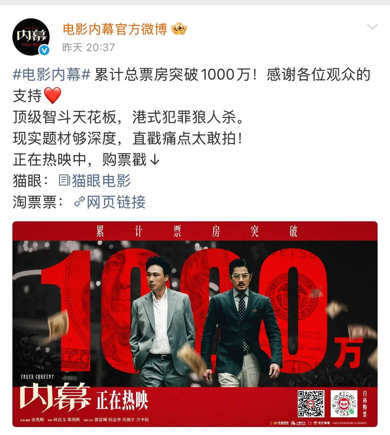 电影《内幕》,23年4月官宣,2025年12月上映,集齐五大影帝,票房四天1000万,看预告还不错,但是就只有这个票房,档期实在太冷太冷,