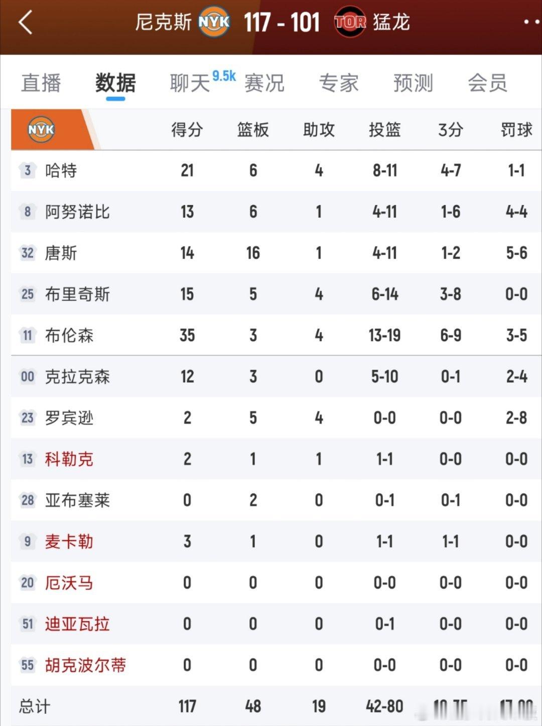 尼克斯客场117-101大胜猛龙,将与魔术会师杯赛半决赛!布伦森35分,19中1
