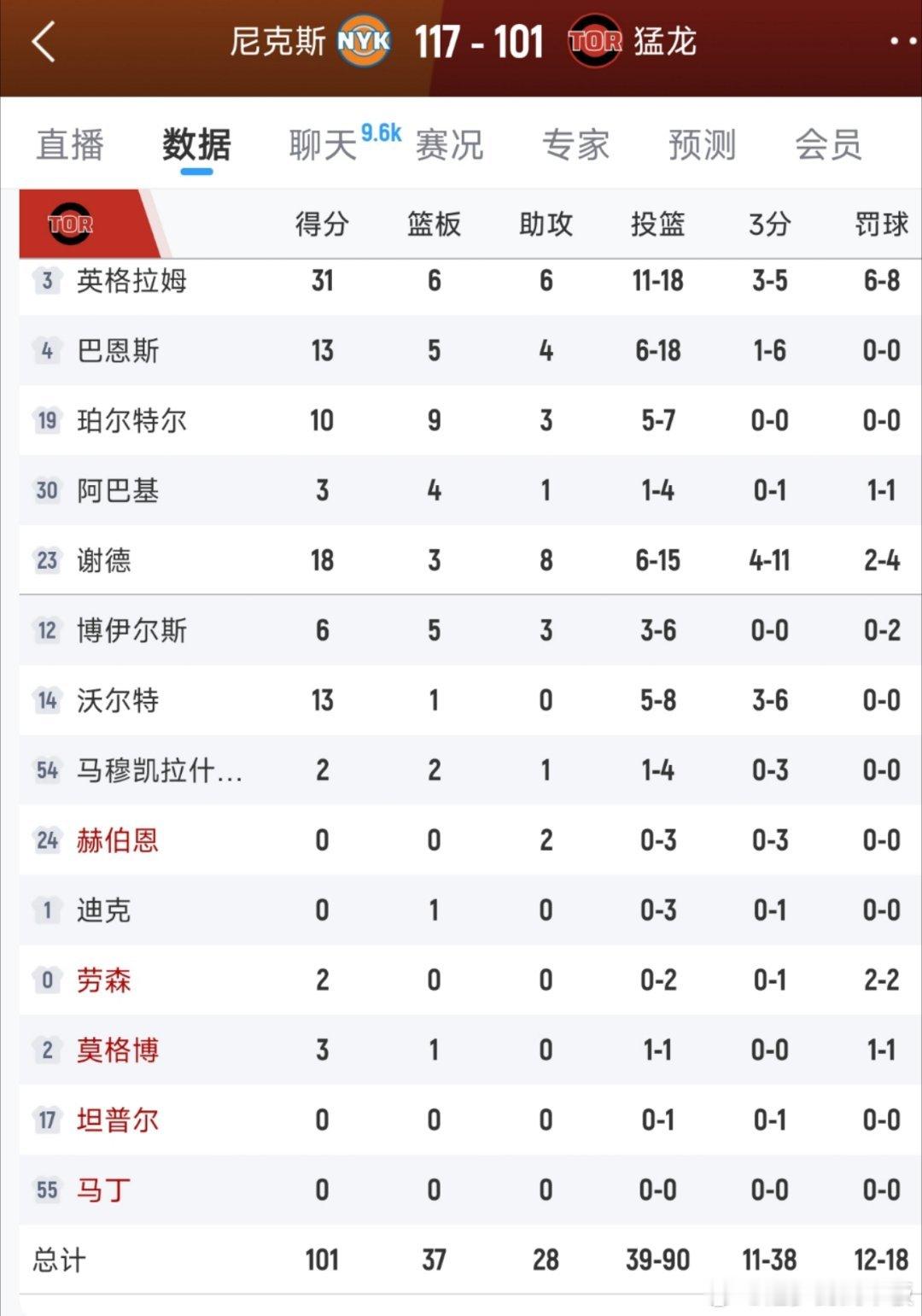 尼克斯客场117-101大胜猛龙,将与魔术会师杯赛半决赛!布伦森35分,19中13;英格拉姆空砍31分尼克斯vs猛龙