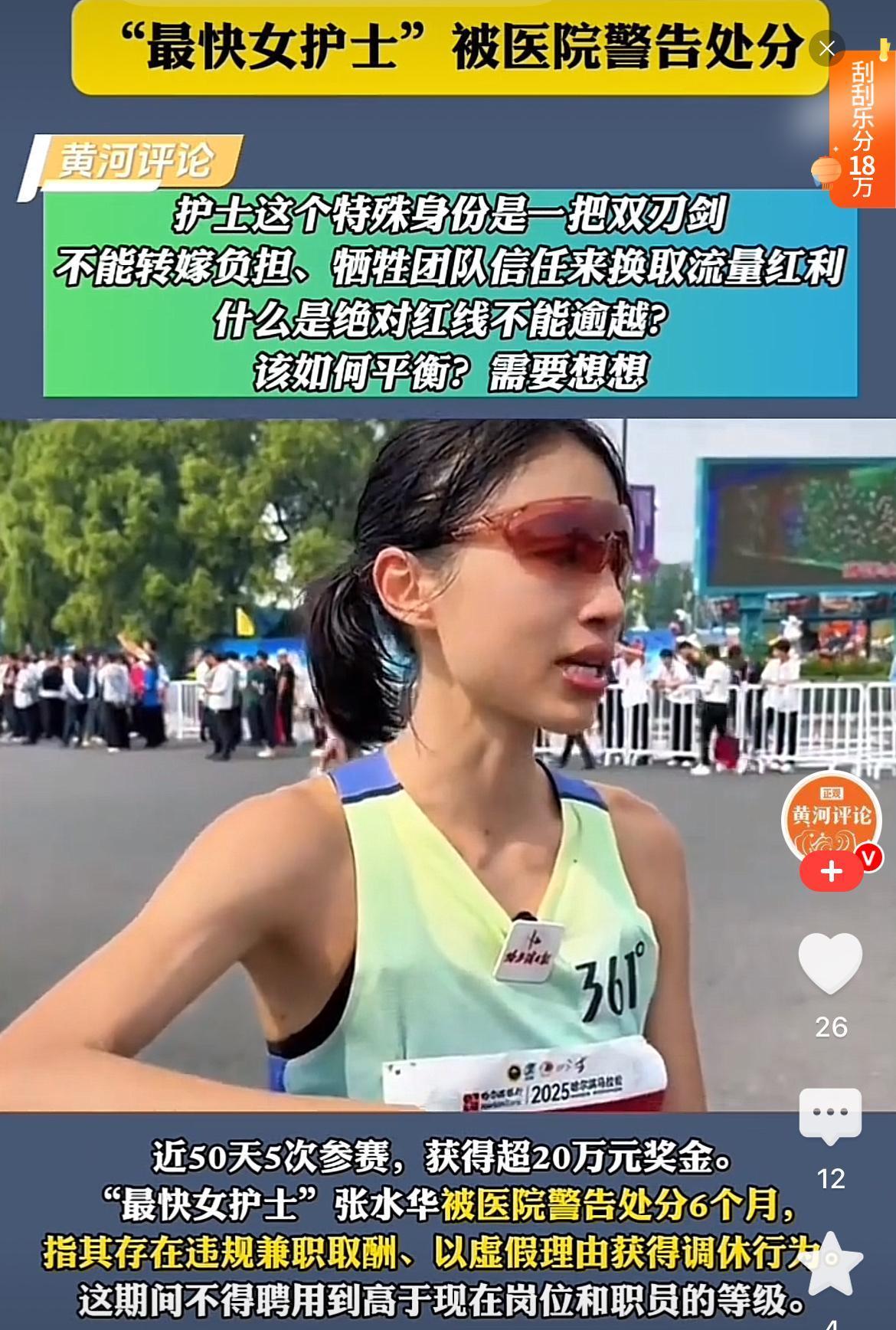 这下好了, 不止医院看不下去了, 就连网友也觉得她有点过分了, 最快女护士张水华,被医院警告处分了,原来她竟然跟医院以虚假的理由请假,参加跑马挣钱!这种行为已经扰乱了医院正常的调休制度了。 这回网友也看不下去了,都在说你既想要体制内的职位待遇,又想要靠跑马赚钱,哪有那么好的事情。 医院这次处罚的对,不然医院的护士都这样,工作怎么做好。 张水华这次应该不好收场了!