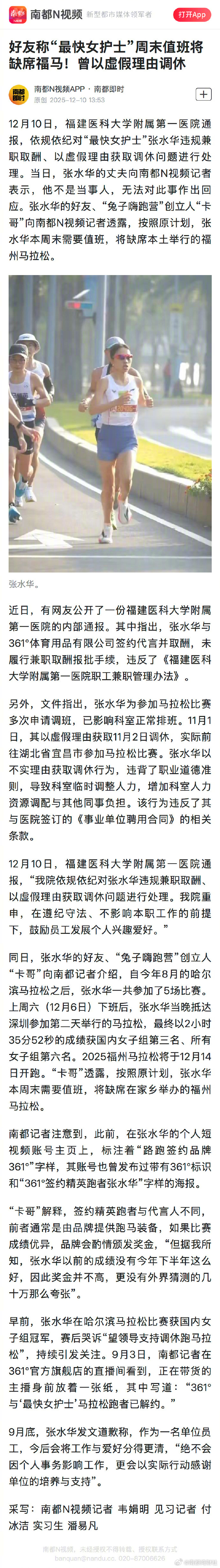 #最快女护士本周末值班将缺席福马#【好友称“最快女护士”周末值班将缺席福马!曾以虚假理由调休】#好友称张水华周末值班将缺席福马#12月10日,福建医科大学附属第一医院通报,依规依纪对“最快女护士”张水华违规兼职取酬、以虚假理由获取调休问题进行处理。当日,张水华的丈夫向南都N视频记者表示,他不是当事人,无法对此事作出回应。张水华的好友、“兔子嗨跑营”创立人“卡哥”向南都N视频记者透露,按照原计划,张水华本周末需要值班,将缺席本土举行的福州马拉松。(南都)