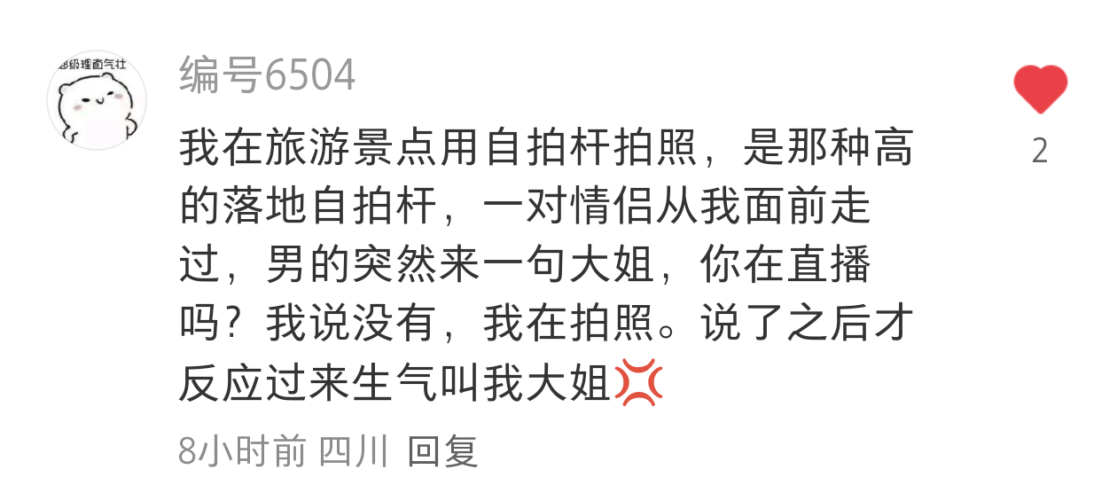 男的突然来一句大姐,你在直播吗?我说没有,我在拍照。说了之后才反应过来生气叫我大姐