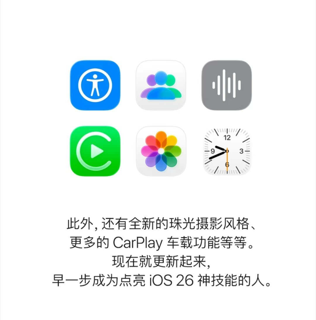 苹果喊话iPhone用户更新iOS26iOS26正式版推送也有一段时间了,各位还没更么。不过话说回来,确实有很多用户,不喜欢更新系统,也不止苹果,安卓也是。经常会看到身边的朋友手机设置图标亮着小红点提示更新,但他们就是不更。有很多觉得更新了新系统,手机会容易变卡,因为功能更多了。而当下的功能已经能够满足使用,所以就不更了。但更新系统除了说有新功能,更多还是会修复bug和安全漏洞这类的,所以有更新,还是及时更新上吧(虽然可能会遇到新的bug)。除非说真的是比较老的机型,更新之后流畅度会更不上,或者电池撑不住。那需要考虑的不是更不更,而是换不换手机了。