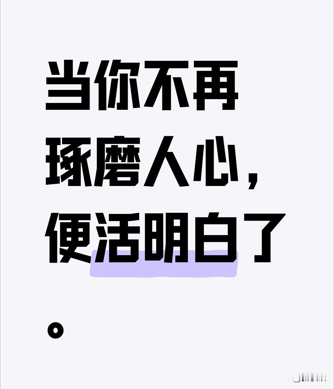 当你不再琢磨人心,便活明白了。 上下五千年,祖先积累下无数宝贵经验,凝结成智慧,告诉后人如何活得明白。 人到一定年纪,还在琢磨人心,觉得其深不可测。其实这是在累自己,给自己找不自在,有喜欢的人却不敢去喜欢,怕一旦陷入,被心所困,力不从心。 有人说人心始终被伪装包裹,这话乍听有理,细想却过于绝对。人不能一概而论,有些人天性单纯,言行即内心写照。若将他们都归入“人心皆伪装”的说法,便抹黑了他们言行一致的品质。这些心思简单的人,从不将人事复杂化,没有害人之心,面相也多显温暖。 凡事纷扰,皆因人心嘈杂。人心简单,事也就清晰明了。所以,简单的人多些是好事。比如相爱的两人,若都心思单纯,幸福指数会与日俱增。 心简单,人就少事;事少,人易幸福,也易相处,事事顺心和谐。 尽管人心被世事浸染,不复淳朴,但你若不理会这些,心就会安静舒坦,日子也会过得惬意。有人说,此时少与人打交道,事自然就少了。 无论怎样,做个简单的人,自己快乐了别人也少事了