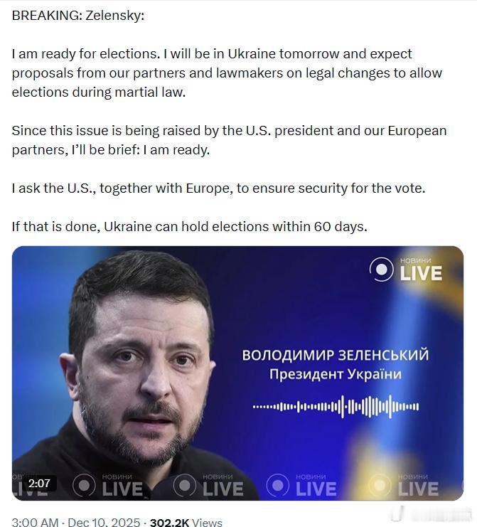 泽连斯基同意进行选举:我已准备好举行选举。我明天将回到乌克兰,期待我们的伙伴和议员们提出在戒严令期间允许举行选举的法律修改方案。既然这个问题是由美国总统和我们的欧洲伙伴提出的,那我就简单说:我准备好了。我请求美国与欧洲共同保障投票的安全。如果这一条件得到满足,乌克兰可以在60天内举行选举。