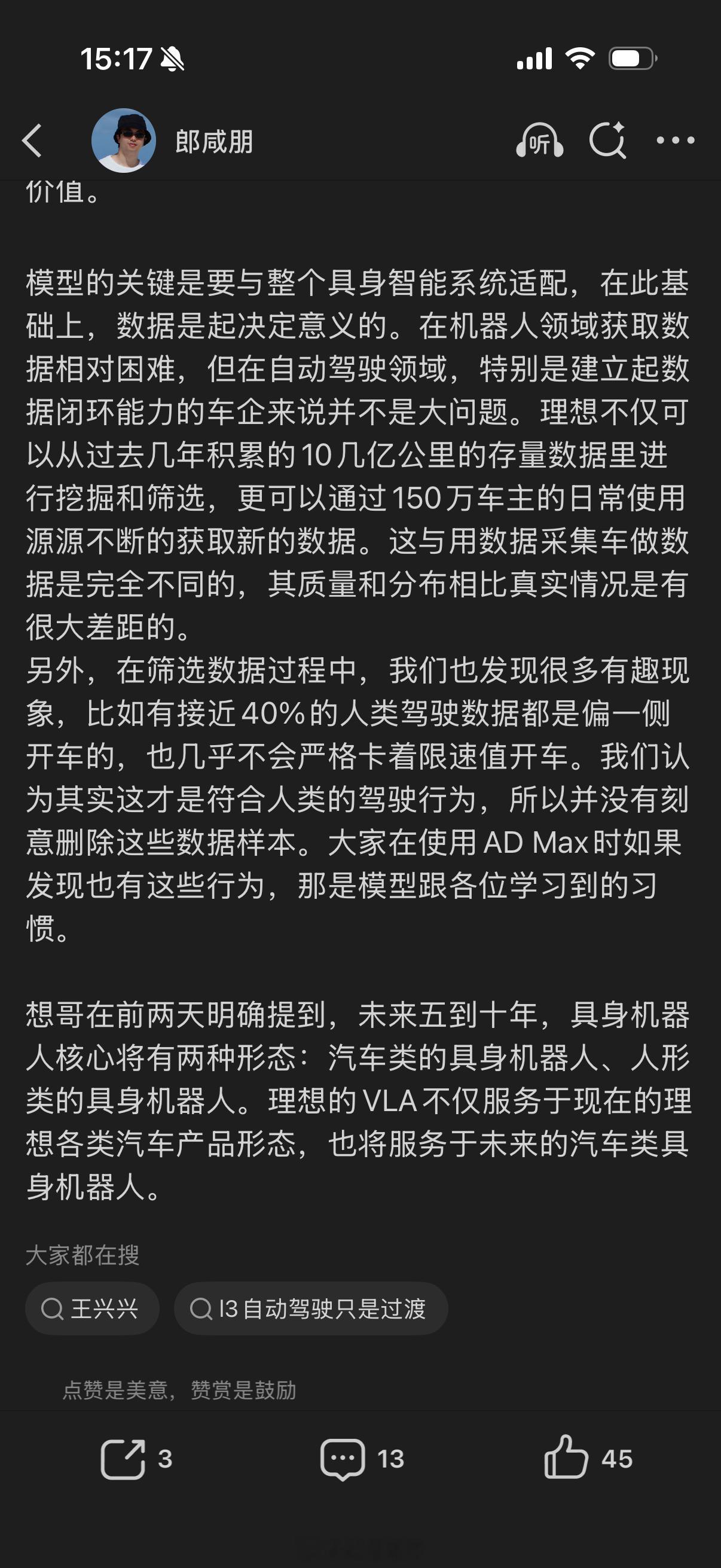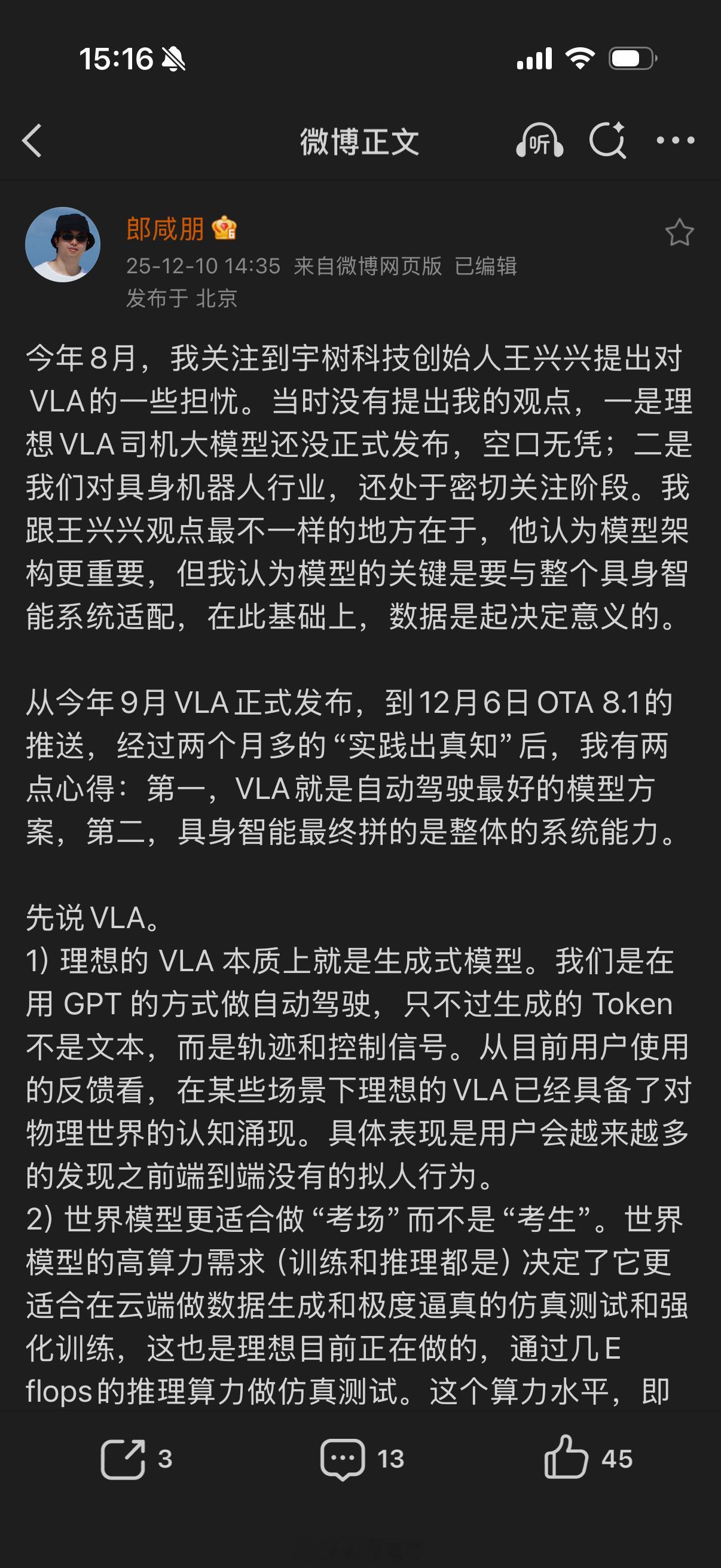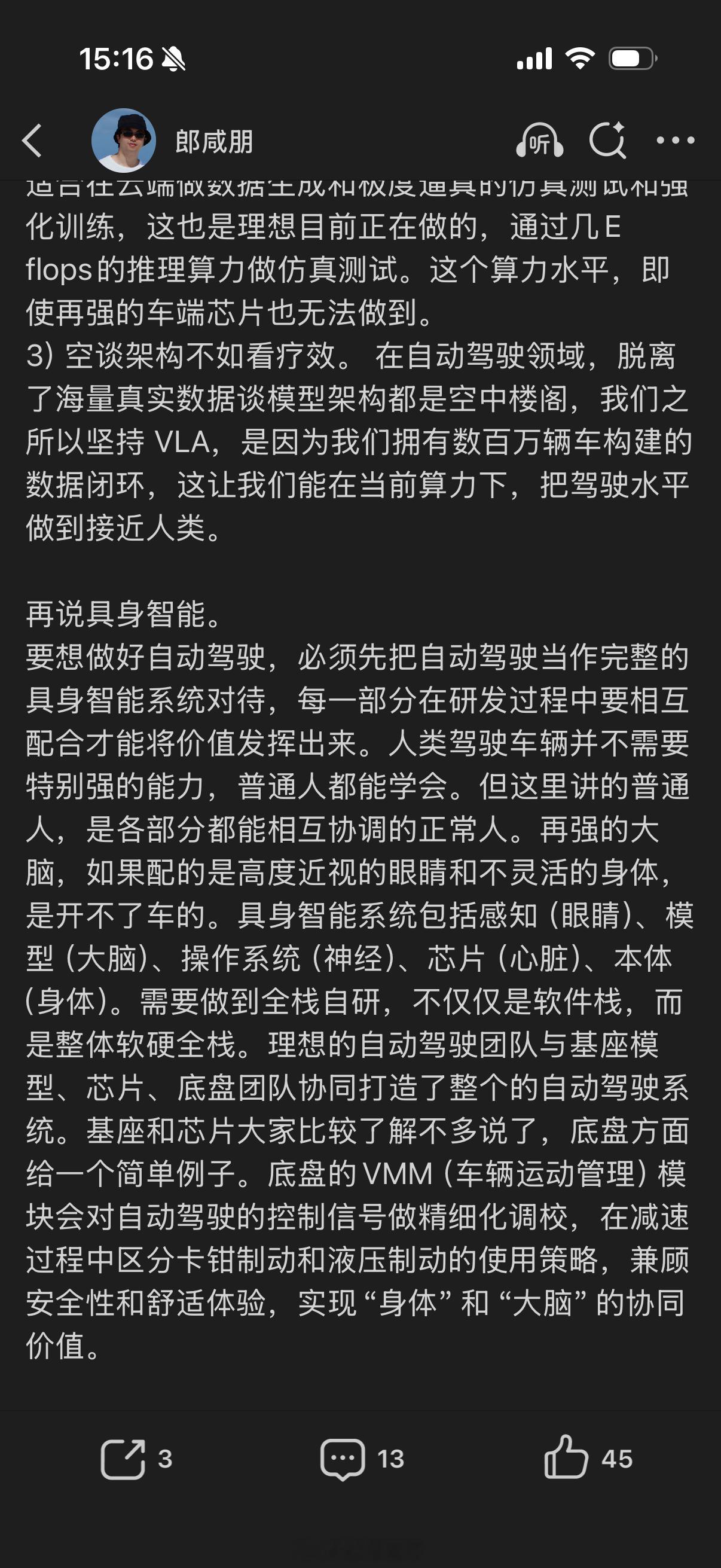 理想汽车自动驾驶研发高级副总裁郎咸朋就近期「王兴兴对 VLA 路线质疑观点以及理想 VLA 与具身智能布局与进展」做了回应。- 郎咸朋认为,架构仅是基础,模型与全栈系统的适配才是关键,而数据规模起决定性作用;VLA 是目前自动驾驶的最佳方案。- 具身智能不是单一的大脑进化,而是脑(模型)+ 眼(感知)+ 身(底盘/芯片)的整体协调。只有软硬全栈自研,才能让智驾模型与底盘深度配合,实现像人一样细腻控制。- 相比机器人行业,车企拥有的数据闭环更多。后期不盲目清洗数据,保留人类驾车的不完美习惯,让模型学出来的不是机器。理想高管回应王兴兴质疑42mark