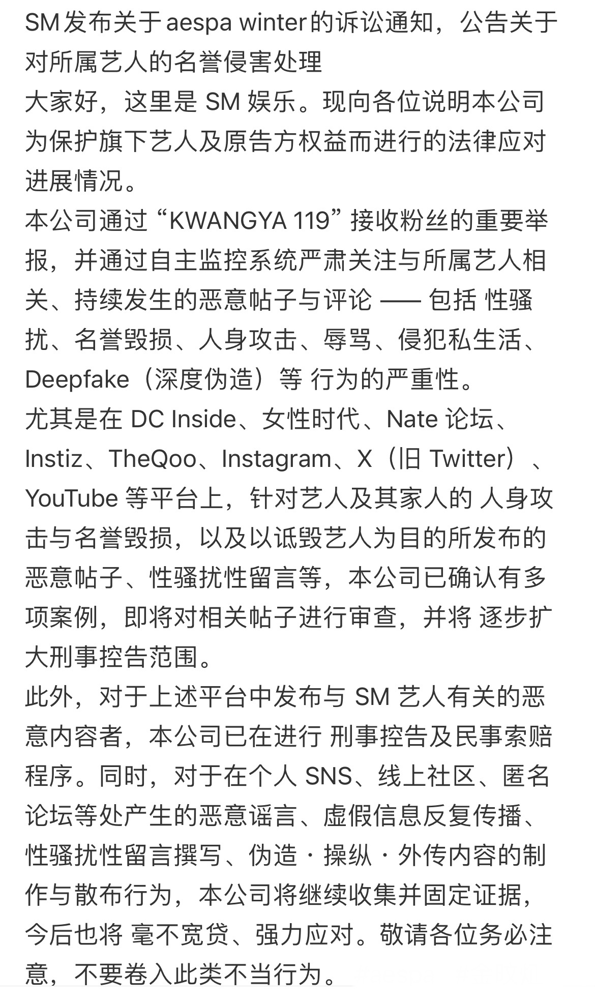 SM发布金玟庭告黑公告 据韩媒,SM发布aespa金玟庭告黑通告,表示公司通过“KWANGYA 119”粉丝举报及自主监控系统关注所属艺人相关的恶意帖子与评论,已经确认多项案例,将对其进行审查,“对于上述平台中发布与SM艺人有关的恶意内容者,本公司已在进行刑事控告及民事索赔程序”。