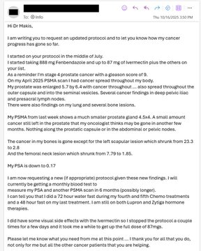 最新文章:伊维菌素、芬苯达唑、CBD油见证——一位63岁的加州男子,患有4期前列腺癌并已扩散至骨骼,3个月后报告:PSA值从44降至0.17,几乎所有转移性疾病都消失了!一些前列腺癌治疗的成功案例简直令人难以置信😃尽管已经有了数百个成功案例,但我时不时还是会感到震惊! 🙏故事:一名63岁的加州男子,患有四期前列腺癌他于2025年2月被诊断出患有前列腺癌,PSA值为30;2025年3月的MRI检查显示骨转移。3月17日的活检证实为格里森评分9分。4月17日,他的PSA值达到峰值44。2025年7月中旬,他开始:伊维菌素 1mg/kg/天芬苯达唑 1000 毫克/天CBD油 100毫克/天亮丙瑞林(自4月11日起)阿比特龙(自4月17日起)多西他赛化疗(5月23日起,共6个疗程)3个月后的结果:PSA 44 至 0.17PSMA PET扫描:“前列腺体积明显缩小至 4.5x4(原为 5.7x6.4),前列腺内仍有少量癌细胞残留……前列腺包膜上未见癌细胞。”“除了左肩胛骨病灶SUV值从23.3降至2.8,以及股骨颈病灶SUV值从7.79降至1.85之外,我骨内的癌症已经消失了。”深部盆腔髂淋巴结和骶前淋巴结——已完全消退(100%消失)这就是治疗协同作用的体现。单靠传统的肿瘤治疗是看不到这种疗效的。然而,伊维菌素和芬苯达唑是化疗增敏剂,能显著增强多西他赛等化疗药物的抗癌作用。伊维菌素和芬苯达唑与激素疗法也具有极佳的协同作用。NEW ARTICLE: IVERMECTIN, FENBENDAZOLE, CBD Oil Testimonial - 63 year old California man with Stage 4 Prostate Cancer to bones, reports after 3 months: PSA 44 to 0.17, almost all metastatic disease gone!Some of the Prostate Cancer successes are absolutely incredible 😃Despite hundreds of success stories, I still get shocked every now and then! 🙏STORY:63 year old California man with Stage 4 Prostate CancerHe was diagnosed with Prostate Cancer in Feb.2025 with a PSA of 30, and an MRI in March 2025 showing bone metastases. Biopsy Mar.17 confirmed Gleason 9.By April 17th his PSA peaked at 44.In mid July 2025 he started:Ivermectin 1mg/kg/dayFenbendazole 1000mg/dayCBD Oil 100mg/dayLupron (from April 11)Abiraterone (from April 17)Chemo Docetaxel (from May 23, 6 cycles)RESULTS after 3 months:PSA 44 to 0.17PSMA PET Scan:“much smaller prostate gland 4.5x4 (from 5.7x6.4) small amount of cancer still left in the prostate…nothing along the prostatic capsule”“Cancer in my bones is gone except for left scapular lesion SUV 23.3 to 2.8, and femoral neck lesion SUV 7.79 to 1.85)Deep pelvic iliac and presacral lymph nodes - resolved (100% gone)This is treatment synergy in action.You never see this kind of response with conventional Oncology treatments alone.However, Ivermectin and Fenbendazole are chemosensitizers and significantly enhance the cancer killing of chemo like docetaxel.Ivermectin and Fenbendazole also have excellent synergy with Hormone Therapy
