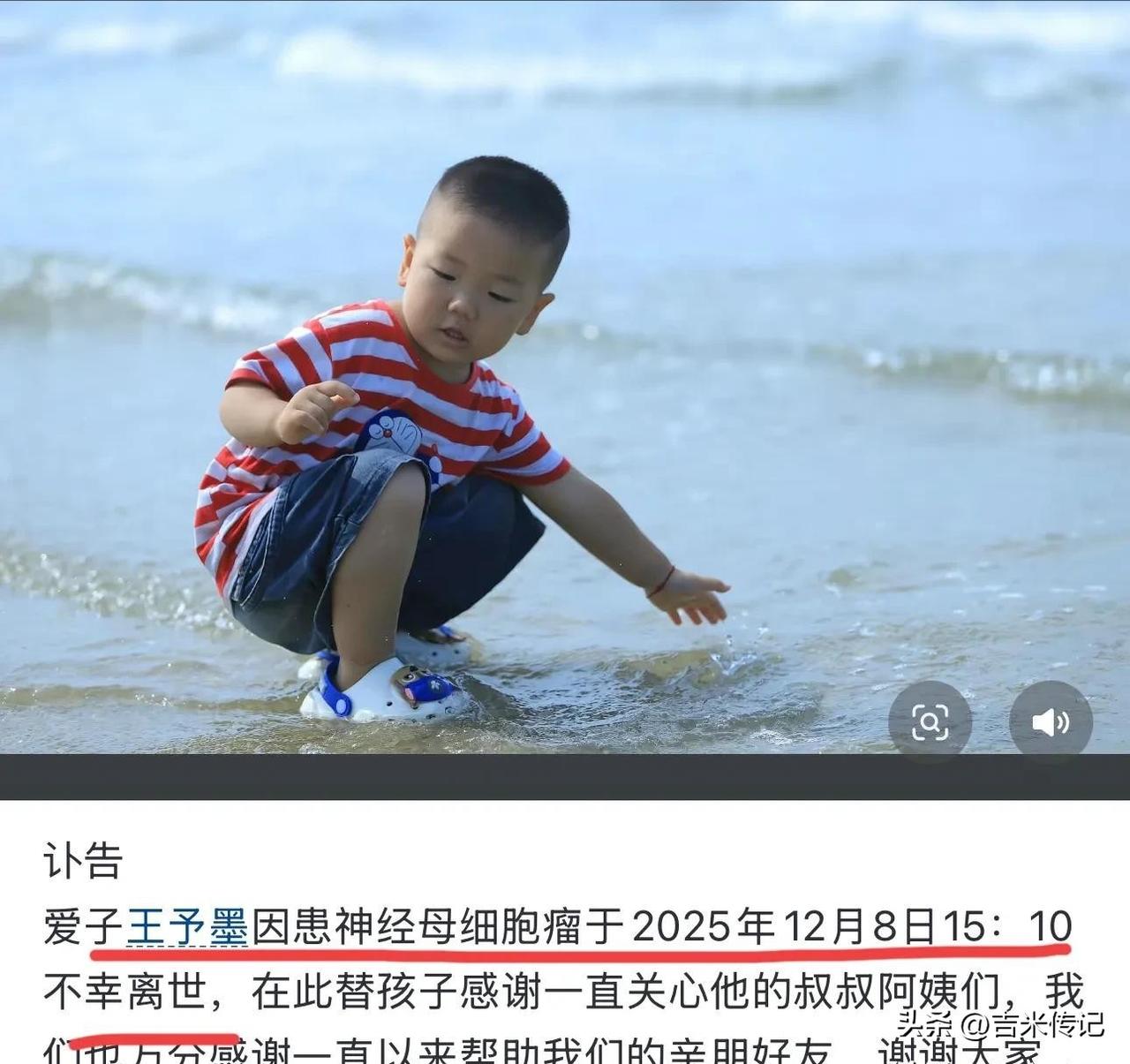 贵州三岁男童确诊癌王.医生坦言无法治愈.母亲怀抱送终. 12月9号贵州有位妈妈发视频说,她家儿子王予墨在8号下午3点10分去世了。孩子才三岁,查出的是神经母细胞瘤,晚期根本治不好。医生说这病早期发现不了,等发现就完了。 他爸妈2022年结婚,2023年生的大宝。去年8月又有了二宝,妈妈之前开玩笑说过"没必要生俩 identical 孩子"。没想到后来孩子生病,网上有人说这话成了预言。 王予墨五月最后一条视频还正常,到六月就开始犯病。家里知道没救了就在家照顾,最后一天他妈一直抱着孩子。现在这事儿让很多家长感慨,健康比什么都重要。