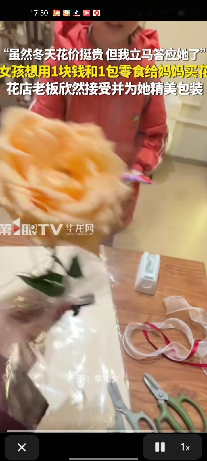 12月9日,四川成都。女孩想用一块钱和一包零食给妈妈买花,可能觉得一块钱买花有点困难,花店老板欣然接受并给花做精美包装,女孩看着精美的包装,只说两个字“好看“。花店老板表示,虽然冬天花价挺贵,但我立马答应她了。